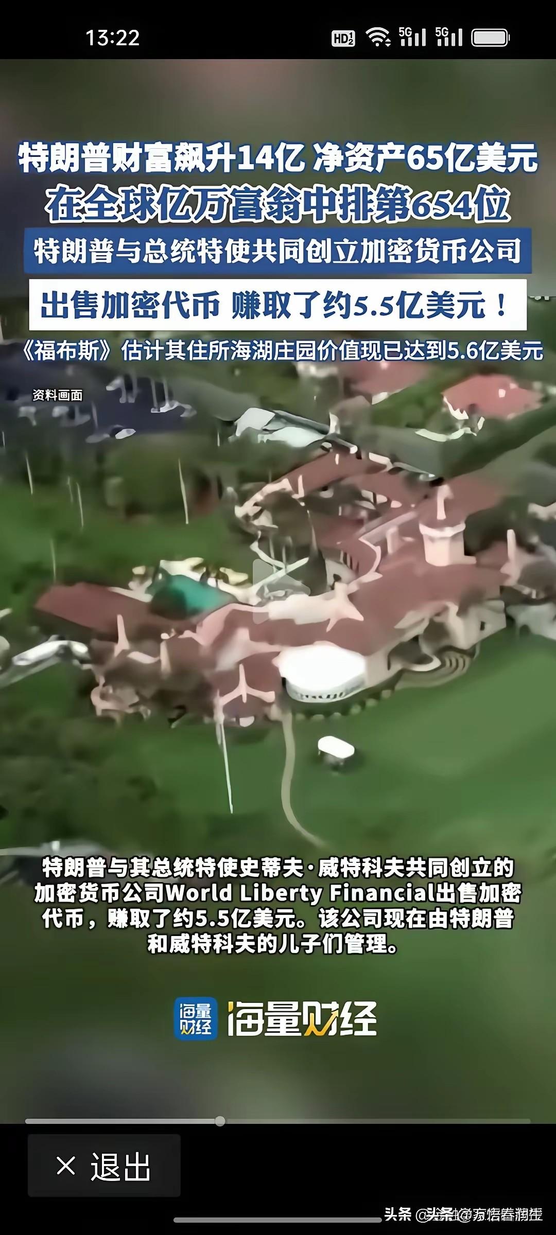 《福布斯》最新《世界亿万富翁》榜单,特朗普身价为65亿美元,比一年前增长了14亿美元,全球富豪榜排第654位。 当总统一年就赚了14亿美元!确实是看不上40万年薪。 还有更巨大的隐性收入,光发行的虚拟货币就进账300亿美元,还有各种家人名下的政治捐款、基金会捐款,…… 房地产确实是不挣钱了! 顶着挨枪子也要干白宫, 这才是家族谋利的最优工具。 美式腐败有哪些颠覆你想象的案例