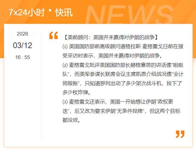 美国根本赢不了伊朗! 这是美国国防部前高级顾问道格拉斯·麦格雷戈的最新表态! 一开始想让伊朗“政权更迭”, 然后又是想让伊朗“无条件投降” 最后,2个目标都没完成,而且也没戏! 大家觉得呢?