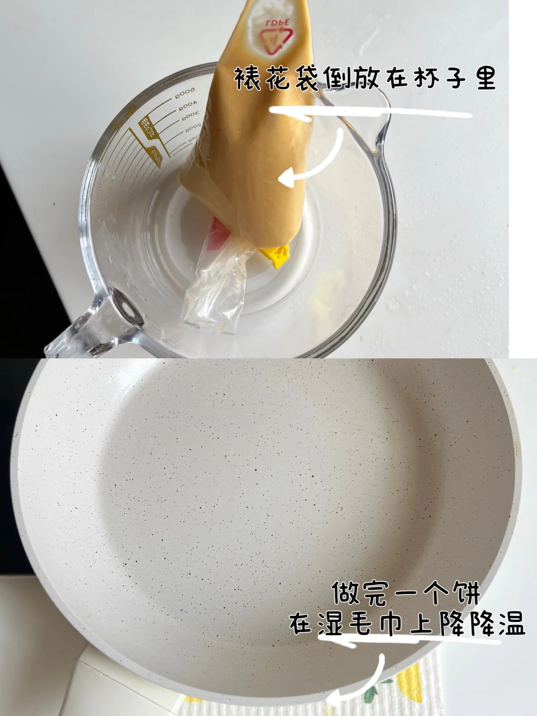 3️⃣裱花袋口不要剪太大,挤面糊可以默数相同的数字,得到的饼皮可以一样大小