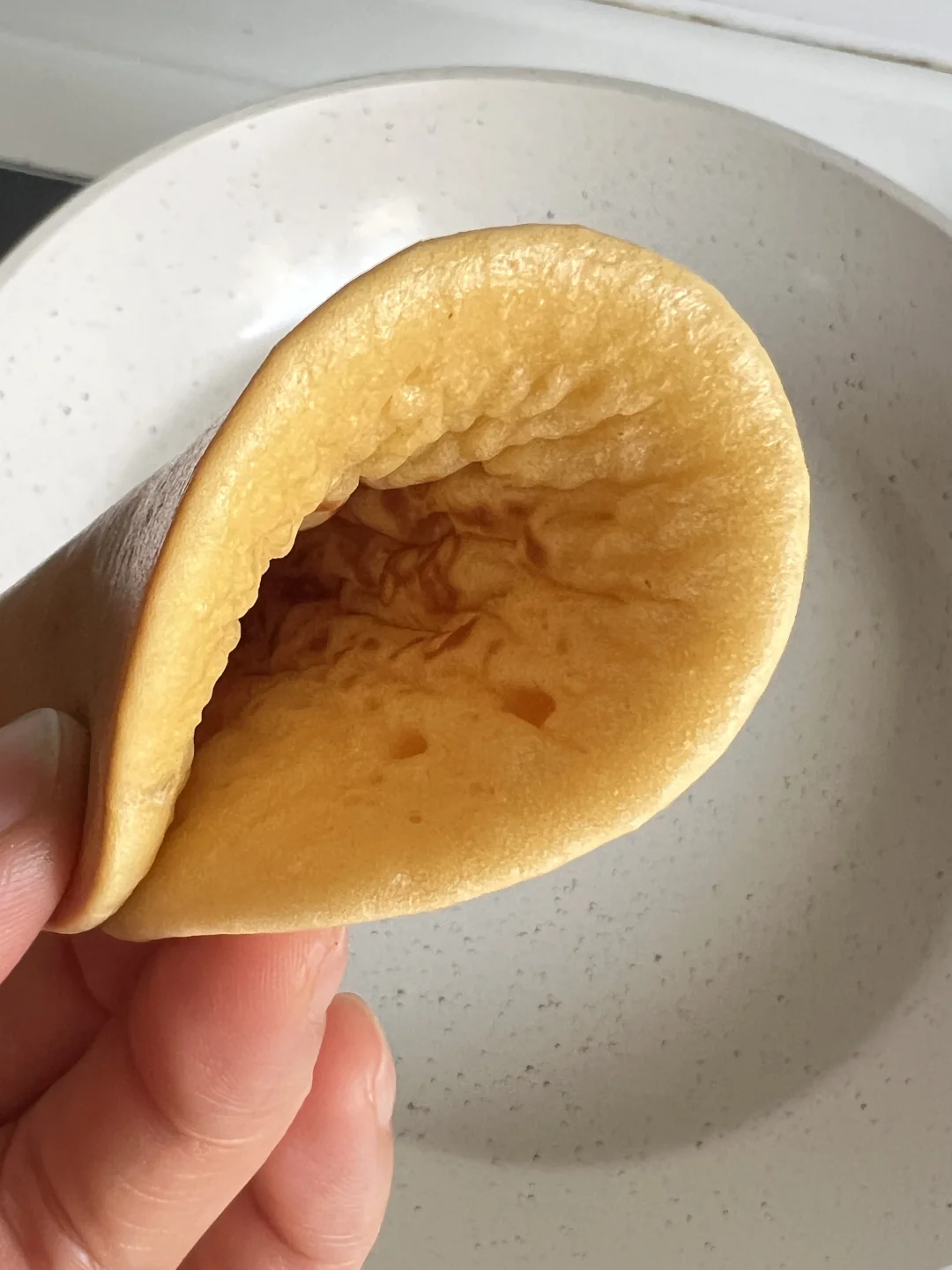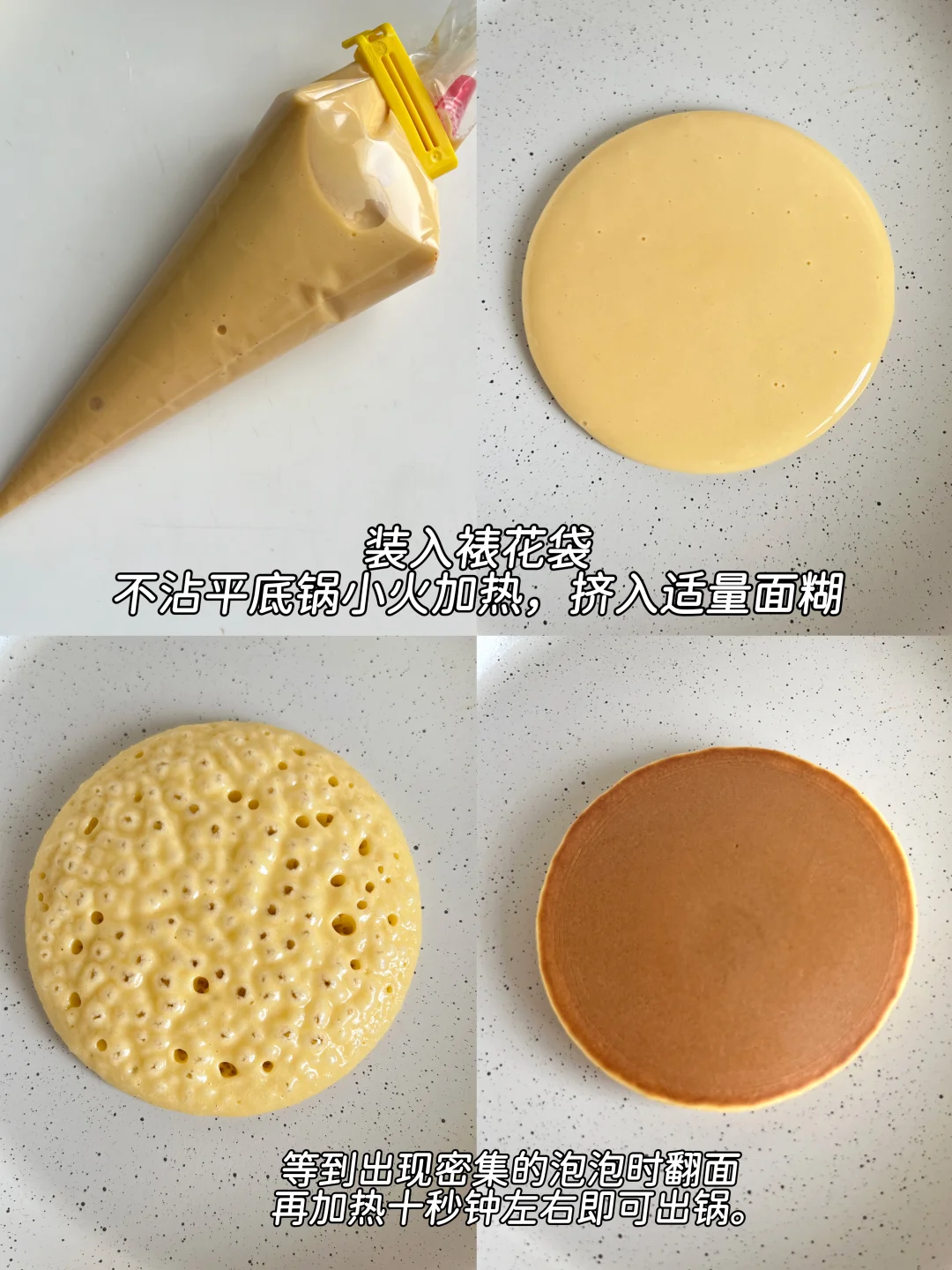 4️⃣不沾平底锅小火加热,挤入适量面糊,等到出现密集的泡泡时翻面,再加热十秒钟左右即可出锅。