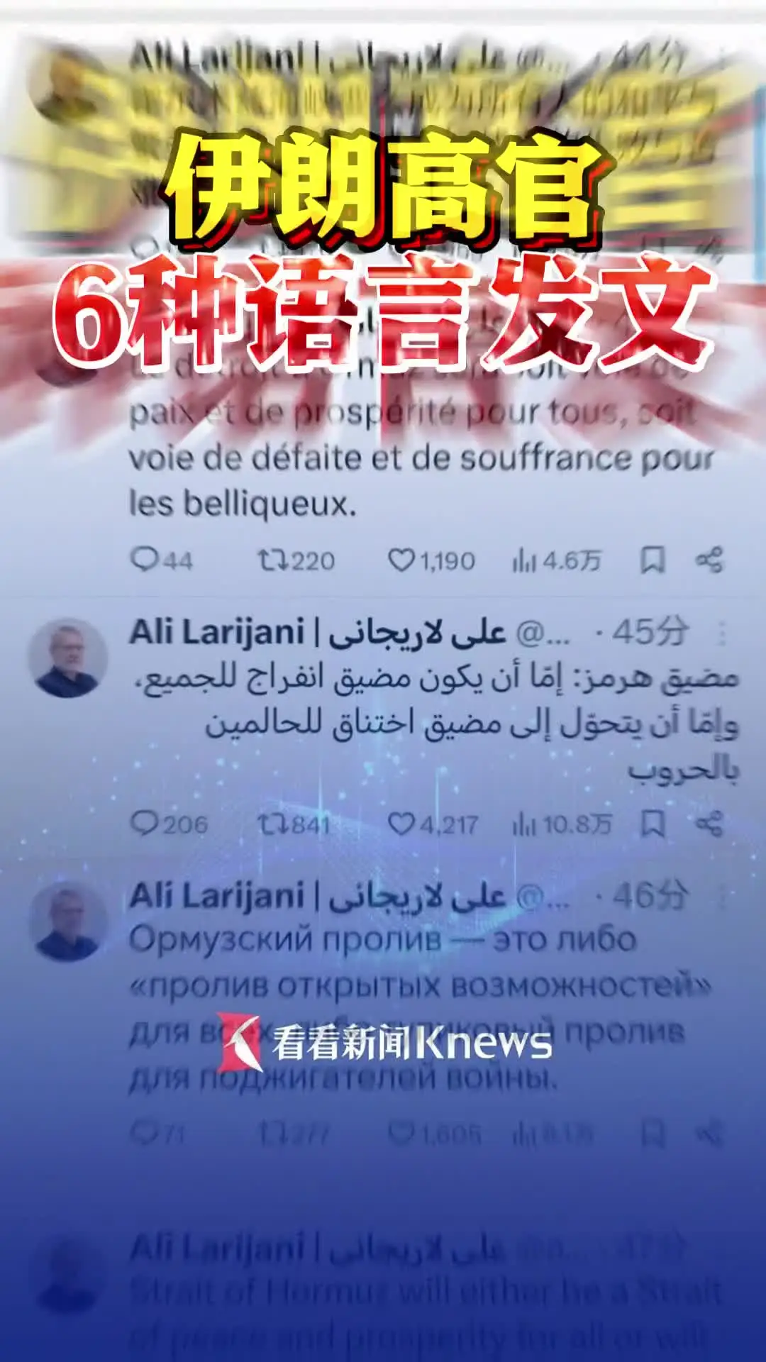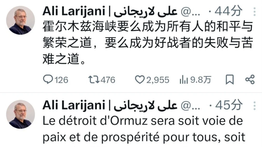 当地时间3月10日,伊朗最高国家安全委员会秘书拉里贾尼在社交平台上发布了一条特殊的动态——他用波斯语、英语、俄语、阿拉伯语、法语和中文共6种语言,写下了同一句话:"霍尔木兹海峡要么成为所有人的和平与繁荣之道,要么成为好战者的失败与苦难之道。"