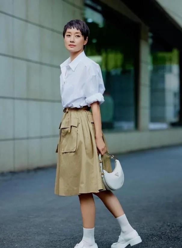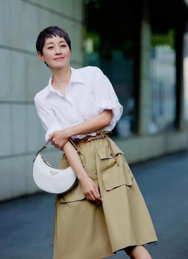 ✨49岁马伊琍,简约穿搭太显高级 白衬衫+卡其半裙,清爽利落又藏着松弛感,超短发衬得整个人干练又精神,完全看不出年龄感~ 马伊琍 简约穿搭