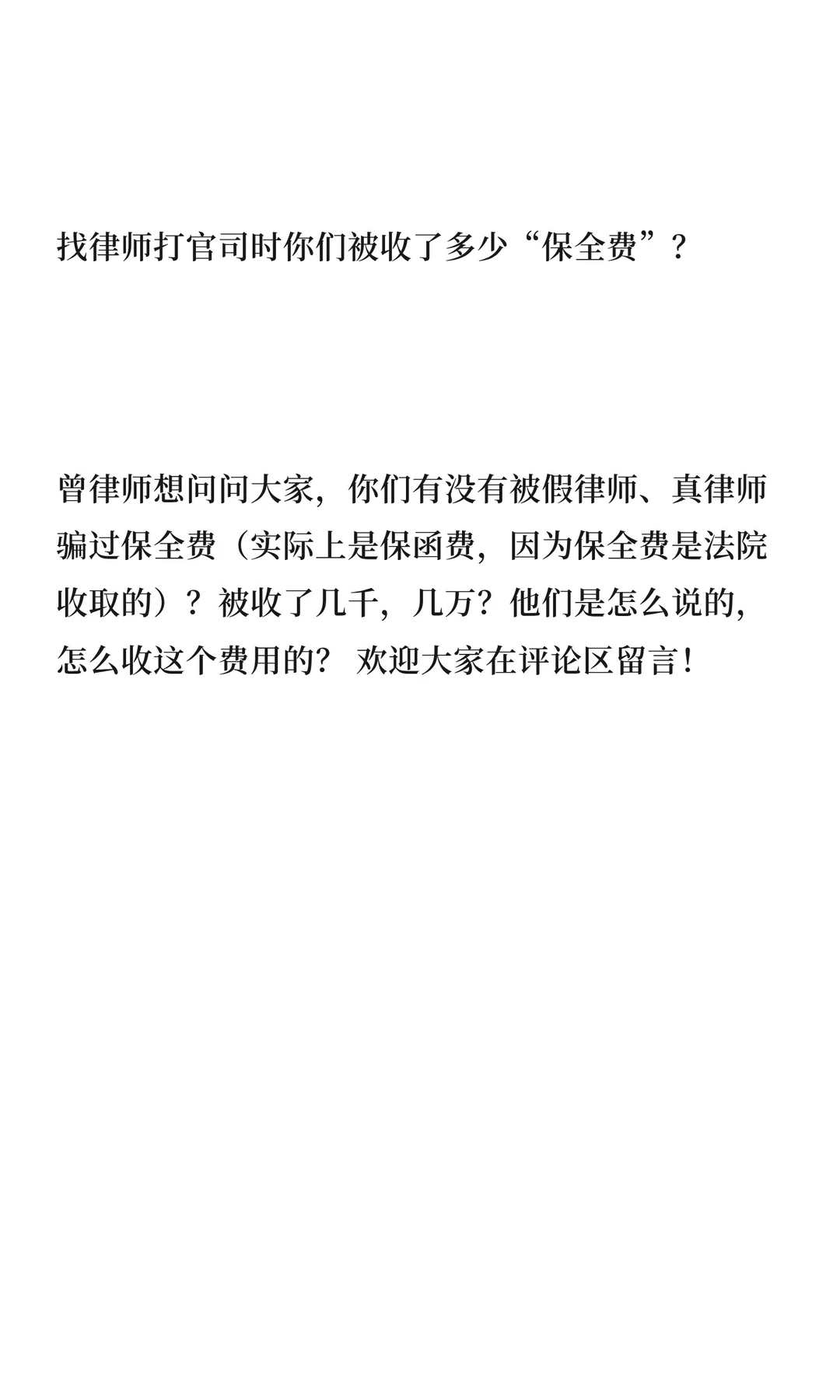 找律师打官司时你们被收了多少“保全费”? 曾律师想问问大家,你们有没有被假律师、真律师骗过保全费(实际上是保函费,因为保全费是法院收取的)?被收了几千,几万?他们是怎么说的,怎么收这个费用的? 欢迎大家在评论区留言!