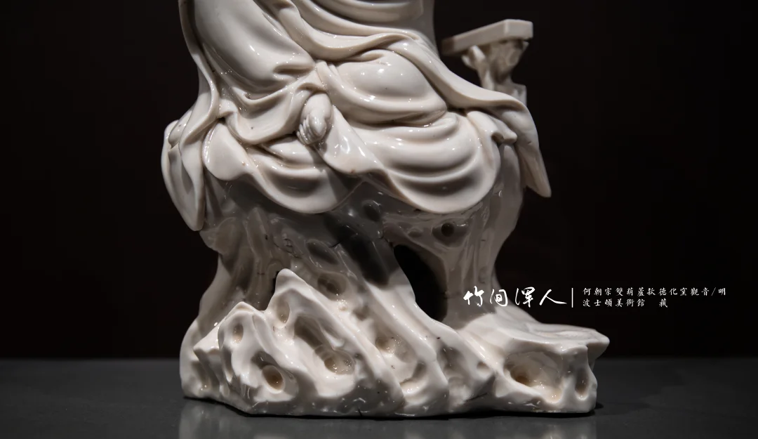 提到德化瓷,又不得不提到德化瓷发展史上有着大宗师地位的人物——何朝宗。很多人知道他可能是因为其作品曾多次被天价拍卖:17年佳士得以1730万港币拍出何朝宗款渡海观音,23年的时候中贸圣佳又以1207万拍出何朝宗款蒲团达摩坐像。何朝宗的作品极其注重艺术性,以达摩、观音等主题居多,线条流畅、表情传神、形象逼真。对后续德化窑发展有很大影响,我看过一些清代的类似作品(例如:洛杉矶郡立博物馆最近在展的那尊),对比之后不禁感叹何朝宗不亏被称为“瓷圣”。