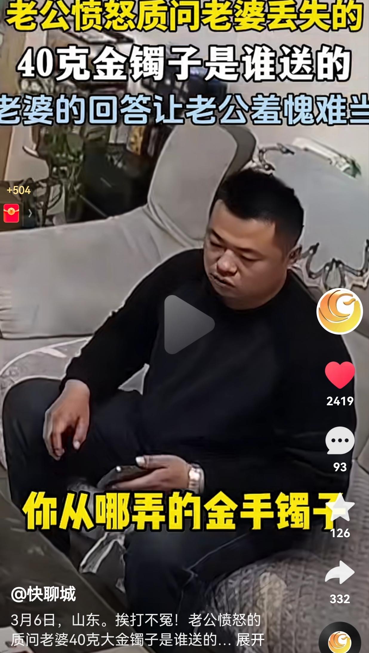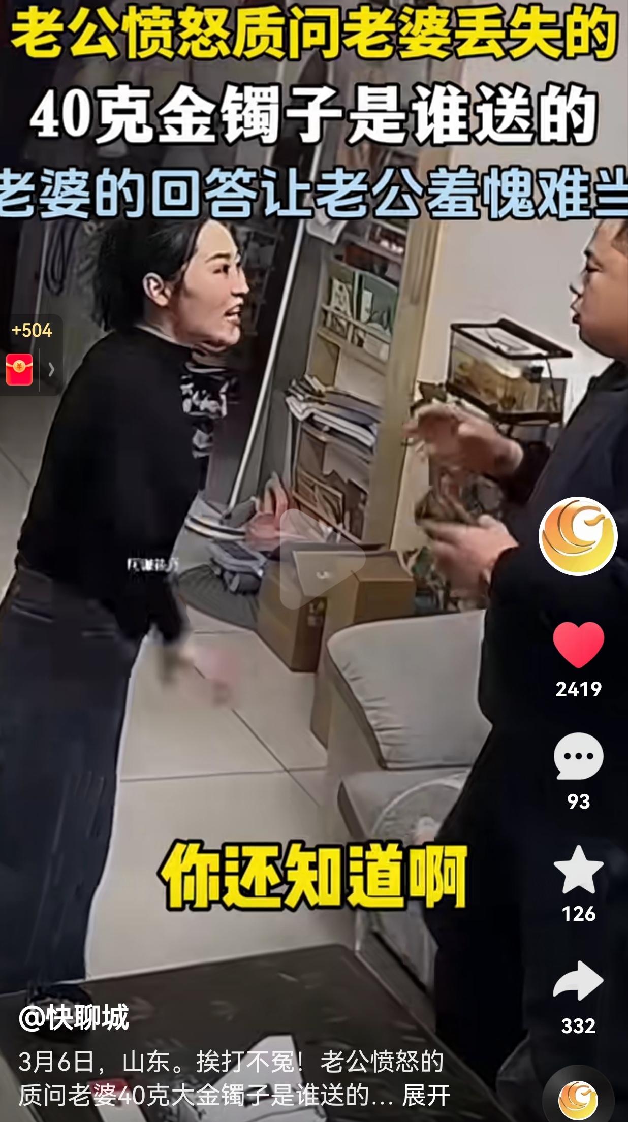 这用的是36计当中的哪一招呀!山东,一女子当着老公的面,故意说:“40克的大金镯子没了!”从女子的语气当中,可以听出,特别急切。 坐在沙发上的丈夫听到后,不解地询问:“你从哪弄的金镯子?” 女子说:“哎呀,你忘了!就是去年结婚纪念日你送给我的惊喜!” 丈夫越听越懵,越听越不对劲,后来直接破防,拍着桌子就吼:“我啥时候给你送过礼物?你说你外面是不是有人了?是哪个男人送给你的?不是,从结婚到现在我送过你礼物吗?你给我说清楚!” 你看他那气急败坏的样,估计脑子里都演完一整部出轨大戏了,就差指着鼻子骂你这个坏女人了! 结果女子直接站在老公的旁边,慢悠悠地翻个白眼,直接扇了个嘴巴子,怒吼道:“你还知道呀!你还知道从结婚到现在没有送过我一件礼物呀!你准备啥时候送呢?难道等我死了,再烧给我啊?” 男人听到老婆的怒吼,瞬间跟霜打的茄子一样,瘫在沙发上低着头,连手机都拿不稳了,那脸涨得跟番茄似的,我隔着屏幕都替他臊得慌! 我太懂这姑娘的小心思了——她根本没丢镯子!就是故意说没了,就是要让他往最脏的地方想,就是要逼他承认:你欠我的,从来不止一个镯子! 她太懂男人了:他那点愤怒根本不是怕“被绿”,是怕自己“没本事”! 他心里门儿清,结婚这么多年,连个纪念日礼物都舍不得掏,连句“我想你”都懒得说,所以才第一时间往“外面有人”上靠——毕竟,承认自己失职,比承认自己抠门、粗心、不爱了,可容易多了! 这姑娘用最狠的话,说最软的理:你不是觉得浪漫矫情吗?那我就用“丢镯子”让你紧张到跳脚。你不是觉得老夫老妻不需要仪式感吗?那我就用“别人送的”让你醋到冒烟;你不是忘了我的期待吗?那我就用你的猜忌,把你的愧疚全给勾出来! 她要的从来不是那点金子,是要让他明白:我要的不是钱,是你把我放在心上的证据啊! 网友看到后评论说:“这姐们儿是我老乡!太会了!我也想这么干,就是怕我老公真去给我买个假镯子。🤣” 也有的网友说:“凭什么女人就得懂事?我就要礼物!就要浪漫!不给我就闹!凭啥委屈自己!” 还有的网友说:“完了,我家那位也刷到了,现在正盯着我看,我得赶紧去搜“金镯子款式”了… 这个视频最爽的地方,根本不是老公羞愧低头,是姑娘敢用“小心机”,为自己讨回公道! 她没哭没闹,没撒泼打滚,就用一句怼人的话,把男人的冷漠、敷衍、自私,扒得明明白白!