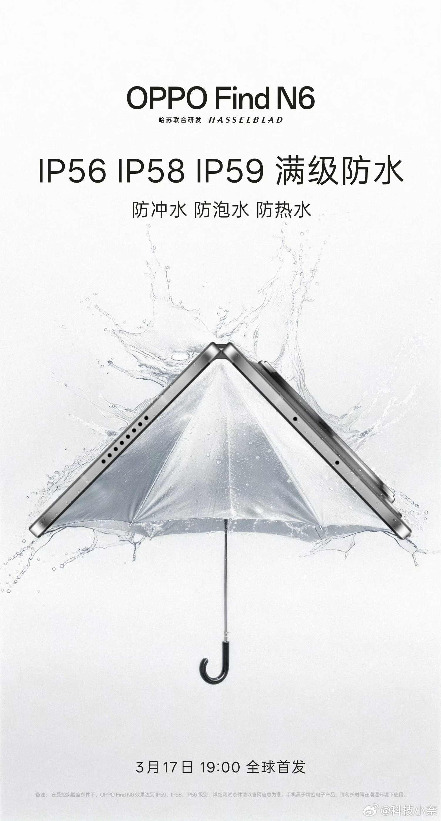 OPPO Find N6支持IP56 IP58 IP59防尘防水,也就是说能防冲水、防泡水、防热水,然后在-20°C也能正常使用。