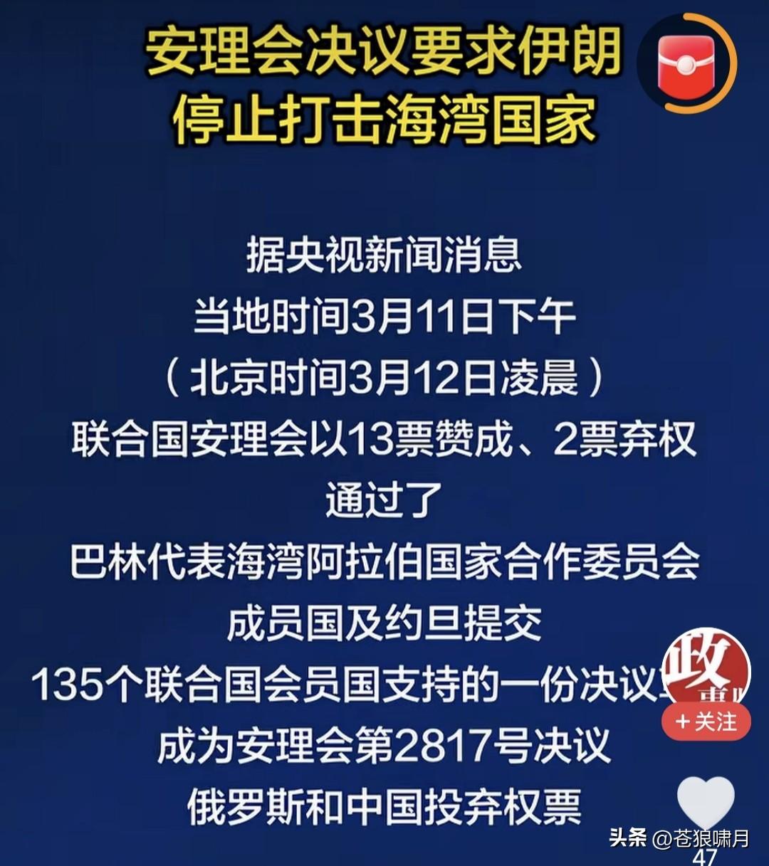 联合国脚踩两只船,不利于叫停美伊冲突!此前古特雷斯明确界定,美以袭击伊朗是侵略行为,应当予以谴责。 转眼安理会通过决议,要求伊朗停止打击邻国!该提案还得到135个成员国支持。加上安理会13票就是148国? 这个票数说明什么?按说美以打伊朗,是干涉一国主权的侵略,伊朗袭击邻国是因这些国家,有美国军事基地,美军飞机就是从那起飞轰炸伊朗的啊! 按照这个分析,伊朗攻击邻国并无大错吧?但148国为何反对这样做?是导弹偏离目标,击中民用设施?还是他们认为伊朗扶持“哈真胡”,应该被打? 还有一件尴尬事:安理会通过上述决议同时,俄也提出一份提案:敦促冲突各方停止军事行动,谴责所有针对平民与民用设施的袭击,但未获通过! 按说这是一份充满正义感的提案,为何未能获得通过?令人不由想到联大几次高票通过决议,要求发动俄乌战争者撤军!大家是否觉得提案很搞笑? 苍狼不谈这些,只是觉得联合国与安理会,需要进行改革了!联合国决议有什么用处?能解决什么问题呢?如果再不改革,真的离解散重组不远了? …………