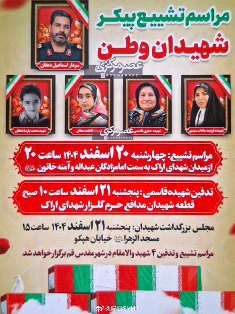伊朗空军指挥官遭袭身亡伊朗革命卫队空军指挥官遇袭身亡据伊朗媒体报道,伊朗革命卫队空军指挥官萨达尔·伊斯梅尔·德甘及其妻子、两个孩子、岳母,在美国和以色列的联合空袭中死亡,地点是在伊朗中央省阿拉克市哈菲齐耶区拉莱巷19号一处居民住宅。当时他乘车到这里,这是他的岳父家。他车辆装有GPS定位系统,事后分析被定位跟踪了。他的葬礼于周三在阿拉克举行。