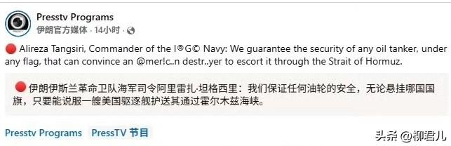 3月11日‖伊朗革命卫队海军司令坦格西里,接受当地媒体采访时表示:我们保证任何油轮的安全,无论悬挂哪国国旗,只要它能说服一艘美国驱逐舰护送其通过霍尔木兹海峡。「新闻来源:伊朗官方媒体Press TV」