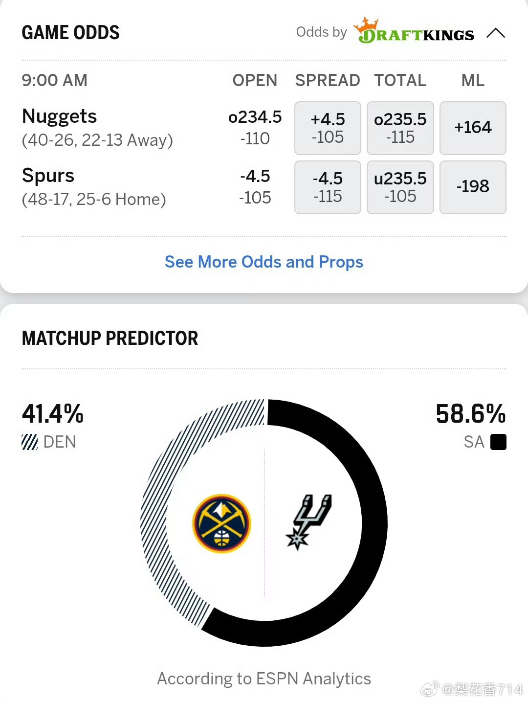 ESPN这次给到马刺胜率高达58.8%!而掘金胜率只有41.4%!两队本赛季首次交手马刺以3分险胜!掘金这边上场面对火箭以36分大胜!穆雷带伤作战全场轰下31分,约基奇轻描淡写16+12+13+5三双到手!马刺这边上场面对绿军以9分取胜!文班此役再度统治攻防两端,全场砍下39+11外加8记三分,绿军对他是一点办法都没有!双方近5战:马刺5胜0负掘金3胜2负双方预测首发:掘金—约基奇,穆雷,约翰逊,戈登,布劳恩马刺—文班,卡斯尔,瓦塞尔,福克斯,尚帕尼双方攻防对比:马刺进攻效率5,防守效率3掘金进攻效率1,防守效率21马刺文班亚马
