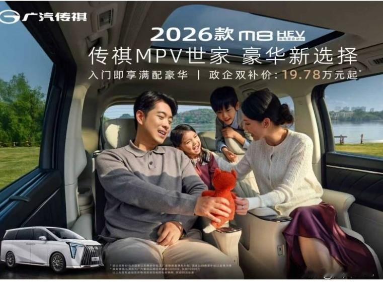 19万时代的新标杆,2026款传祺M8HEV重塑了豪华混动MPV!政企双补后仅19.78万元起,以亲民的价格把豪华混动MPV真正的带入到了19万的时代,成为了我们家庭和商务出行的最佳优选。 2026款传祺M8HEV外观延续了宗师系列大气、时尚又稳重的设计,有着大尺寸的格栅气场帅呆了。全系标配的LED流水的灯,双侧电动滑门与全景天窗,把体面感拉的满满的。车身长5212mm,轴距为:3070mm,有2+2+3的大七座布局,灵活又多变,满载满位也不拥挤很舒适。 动力搭载了2.0T混动专用发动机以及2档DHT,最大功率达到140kW,起步超轻快,超车又从容。WLTC百公里油耗低到了6.15L,一箱油续航达到了1057公里,根本无需充电又无续航焦虑,这款车让我们的日常通勤和长途自驾既省心又省钱,友你说这款车给力不给力。