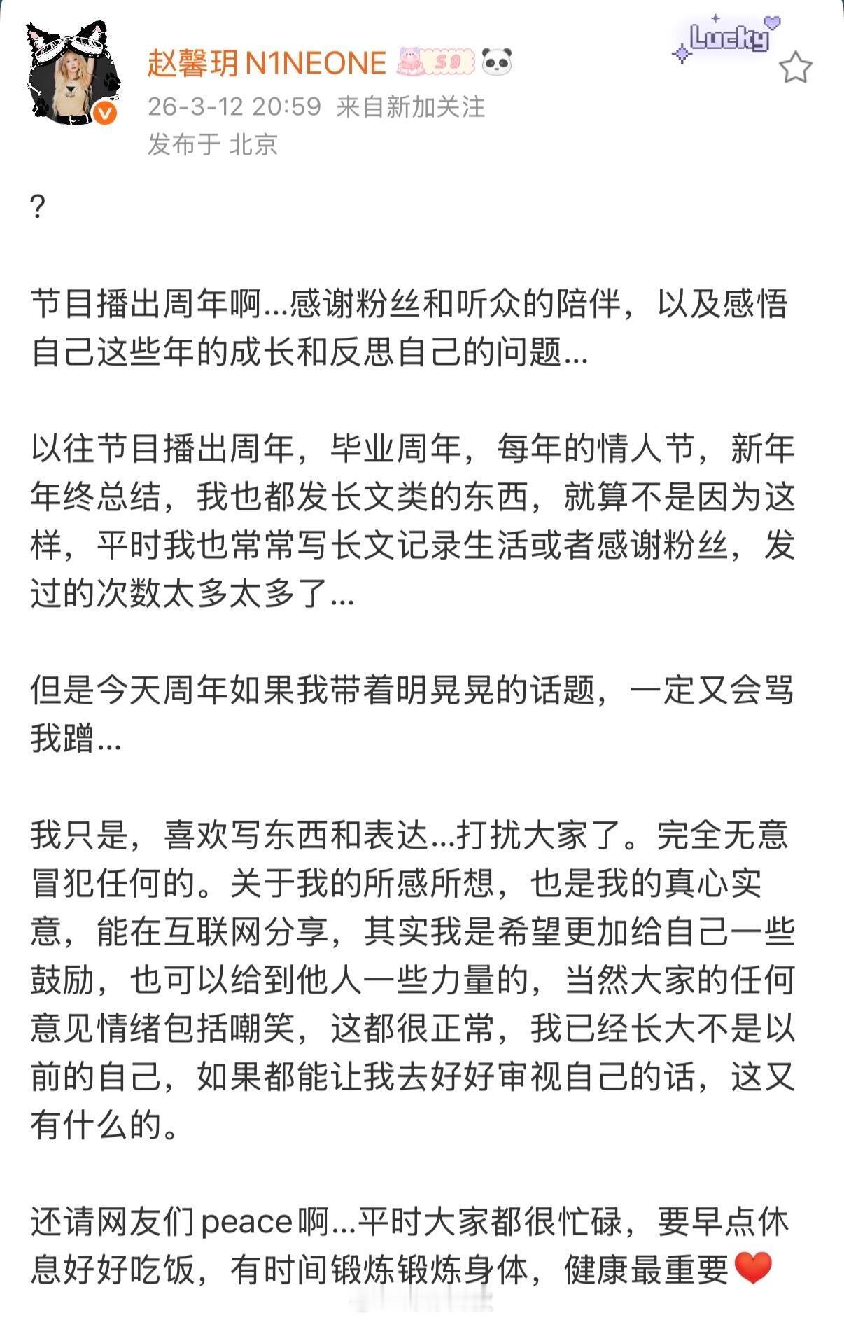 乃万再发文称只是对青你2开播六周年的感悟“节目播出周年啊…感谢粉丝和听众的陪伴,以及感悟自己这些年的成长和反思自己的问题…以往节目播出周年,毕业周年,每年的情人节,新年年终总结,我也都发长文类的东西,就算不是因为这样,平时我也常常写长文记录生活或者感谢粉丝,发过的次数太多太多了…”