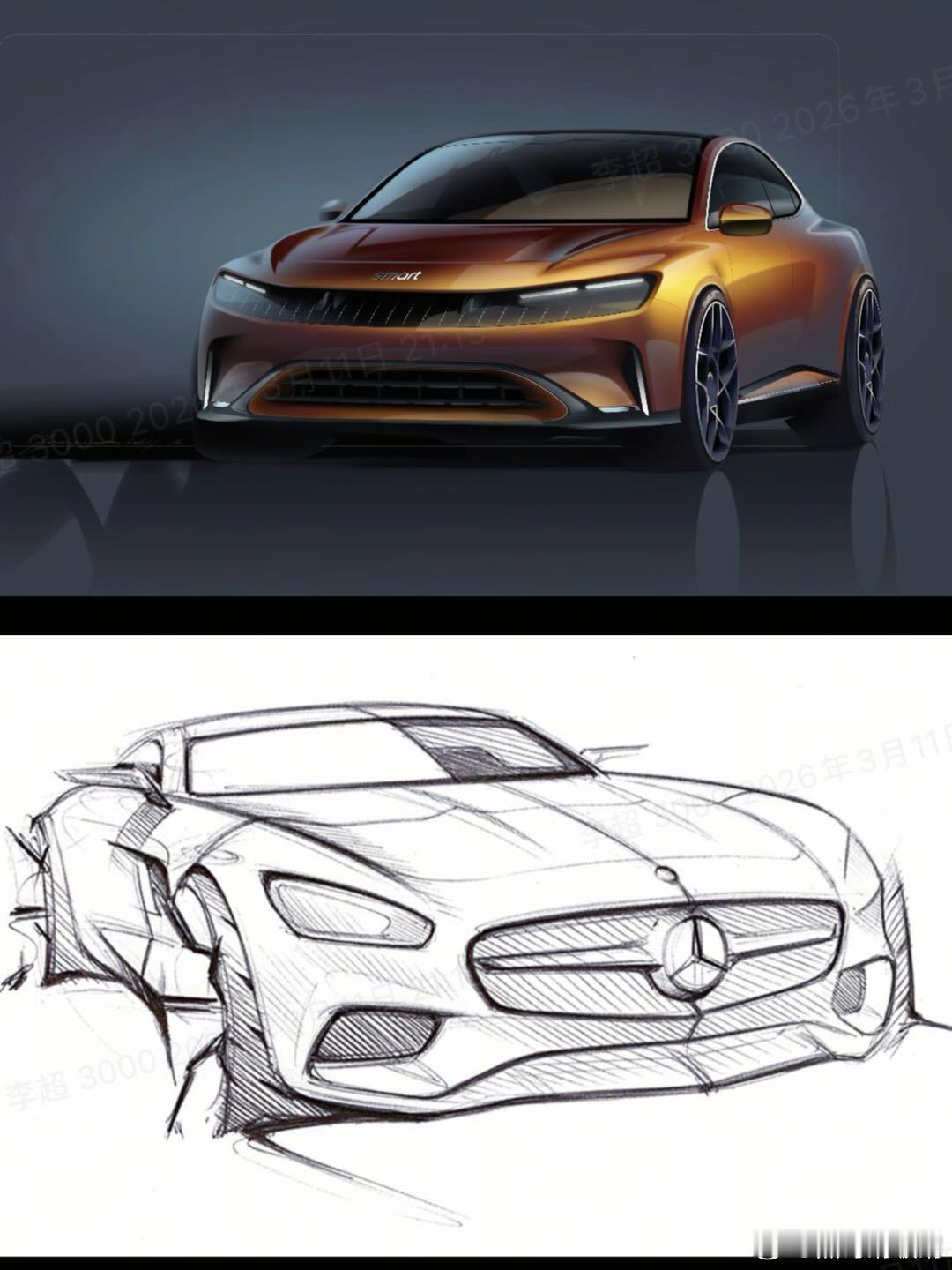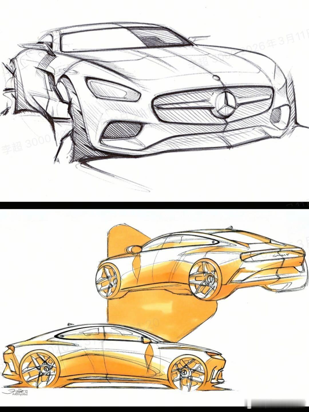 二、句点:smart 6手稿里的秘密现在,让我们把目光转向这份刚刚释出的smart 6手稿。如果你熟悉瓦格纳的作品,你会在这张手稿里看到太多熟悉的“笔迹”。首先是那条“穹线”。从A柱开始,优雅地划过车顶,一路贯穿至尾翼,一气呵成,没有一丝犹豫。这条线在AMG GT上出现过,在CLS上出现过,现在,它在6上再次出现。但在6上,这条线被赋予了新的意义——纯粹的电车比例。CLS的溜背,要迁就发动机舱、变速箱、传动轴;而6的溜背,只需要遵从美学本身。四轮四角的设计,把车轮推向四个角落,最大限度释放了轴距空间,也让那条穹线可以从容地划过整个侧面,不被任何功能性妥协打断。瓦格纳在smart上找到了更自由的画布。其次是那个“翘臀”。近4.9米的车长,在CLS上可能意味着修长舒展,但在6上,瓦格纳却让它保留了性能车般的紧致感。看手稿的后翼子板——那条微微隆起的肩线,那种饱满的肌肉感,是不是让你想起了AMG GT?瓦格纳把他最钟爱的跑车线条,融进了这台掀背轿车里。这让6在优雅之外,多了一分野性。最后是“静则优雅,动则凌厉”的矛盾统一。手稿中的6静止在那里,线条柔和,姿态从容;但那些锋利的肩线、凌厉的灯组造型,又在暗示着它的另一面。瓦格纳说过,好的设计必须是美丽与智慧并存的。6的智慧,就在于它懂得在不同光影下,呈现不同的性格。