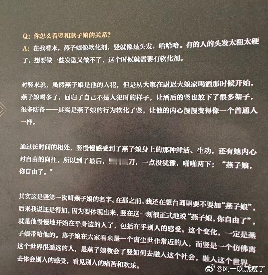 感觉观众对角色的百般解读,都不如演员轻轻的一句:“是燕子娘教会了竖如何去融入这个社会,融入这个世界,去体会别人的感受,看见别人的痛苦和快乐”🥹