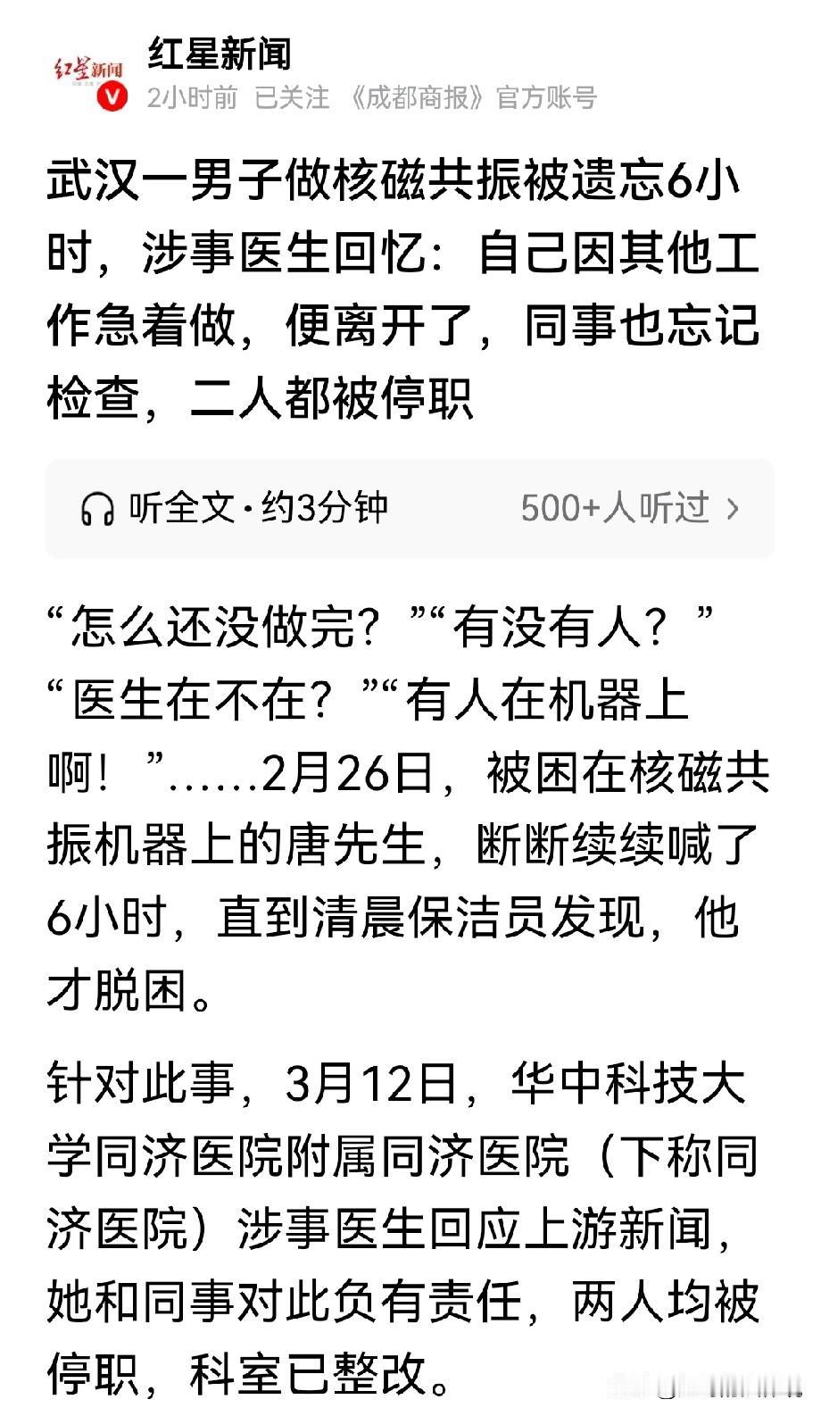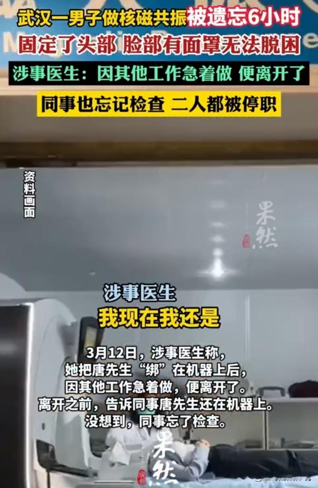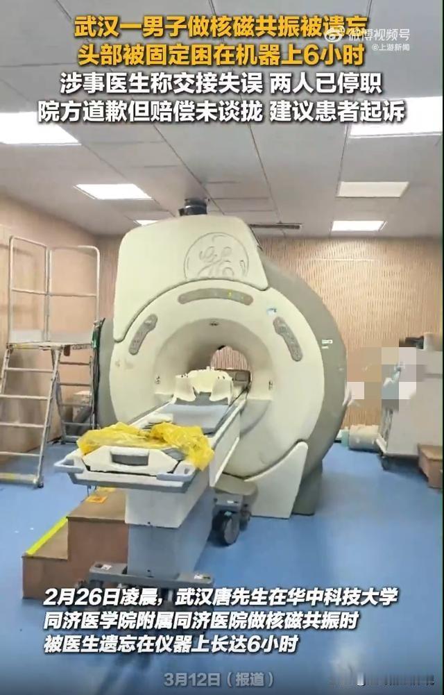 湖北武汉,一男子脖子疼,去医院做核磁共振检查,万万没想到,进到机器里容易,出来比登天都难!他被医生被固定在机器里后,直接下班走了,一直被遗忘6小时,男子喊破了喉咙,都没人应,到天亮才被保洁救下来。涉事医生:忘了。 唐先生躺在核磁共振的机器里,脑袋被固定得死死的,脸上还扣着个面罩。 他本来以为就是做个普通检查,二三十分钟完事回家睡觉。 结果这一躺,就是整整六个小时,直到第二天清早,保洁员来打扫卫生,才听见有人喊救命。 事情发生在2月25号晚上十点多,唐先生因为脖子疼,去医院做核磁共振。 一直等到零点左右,才轮到他进了检查室。 医生把他安顿好,固定头部,扣上面罩,然后机器开始运转。 唐先生闭着眼等着,心想很快做完了就能回家。 可过了快半小时,机器还在响,也没人来管他。 他试着喊了一声:“做完了吗?”没人应。 他又喊:“有人吗?”还是没动静。 他开始急了,汗顺着脖子就往下淌。 他又扯着嗓子喊:“医生呢?有没有人啊?”回应他的只有机器的嗡嗡声。 他想动,但脑袋被固定着不敢乱动。 想坐起来,又怕机器还在工作出啥事。 手机放在窗台的桌子上,够又够不着。 他只能这么躺着,喊一阵歇一阵,嗓子都喊哑了,愣是没人听得见。 那么外面到底啥情况呢? 原来,那个给他做检查的医生,把唐先生“绑”到机器上之后,突然想起来还有别的事要忙。 她当时在系统上点了一下,显示唐先生检查已完成,然后就匆匆走了。 临走前,她倒是跟同事提了一嘴,说机器上还有人。 但那个同事转头也忙别的去了,把这事忘得一干二净。 就这样,唐先生被遗忘在检查室里。 凌晨两三点,医院走廊静悄悄的,偶尔有人路过检查室门口,谁能想到里面还躺着个大活人? 唐先生中间听见外头好像有人走动,拼命喊,但检查室的门关着,隔音还不错,没人听见。 他后来说,那6个小时感觉比6天还长。 心里又怕又气,怕的是这机器一直响,万一有啥辐射或者出故障咋整? 气的是,这么大个医院,做个检查能把人忘里头? 他试着安慰自己,也许医生临时有事,一会儿就回来。可是一小时过去了,两小时过去了,还是没人。 到了凌晨5点多,他已经喊不动了,心里恐惧的直哆嗦。 就那么睁着眼盯着天花板,想着老婆在等他,电话打不通该多着急。 想着天亮要是还没人发现,他该怎么办。 他甚至想过自己挣脱固定装置爬下来,但又怕出危险,只能继续躺着等。 一直到了6点的时候,门外终于传来动静。 唐先生就像抓到了一根救命稻草。 他用尽力气喊了一嗓子:“有人吗?” 门外面的保洁员吓了一大跳,检查室里咋还人喊救命? 她赶紧跑去喊保安,保安跑来一看,才赶紧给唐先生松开固定装置。 把唐先生从机器上扶下来,此时他腿都软了,站都站不稳。 这时候,他老婆早就急疯了。 唐先生来医院一直没回家,电话打了几十个都不接。 她半夜跑到医院来找人,保安拿着记录说,系统显示,唐先生凌晨零点10分,就做完检查了。 她又报警,民警调监控,也没看到唐先生出去的画面。. 她就在医院里到处转,找了一夜,直到早上接到老公电话,才知道人被关在检查室里6个小时。 他们找到医院讨说法,涉事的医生解释说,确实是她疏忽了。 她急着去忙别的事,系统上点了完成,跟同事简单交代了一句就走了。 同事也忘了检查机器上还有人。 医院的处理方案下来,两个人都被停职了。 医生说,核磁共振机器一般不会关机,因为要保持低温稳定,所以一直响着。 这个对检查本身对身体没影响,不用担心辐射。 但唐先生担心的哪里是辐射?是一个人被关在漆黑冰冷的机器里6个小时。 叫天天不应,叫地地不灵的那种恐惧,是别人无法体会到的。 医院给唐先生道了歉,但赔偿金额没谈拢。 院方建议他去起诉! 唐先生万万没想到,看个脖子,最后还得打官司。 有人认为,医院必须承担负责任,如果没有辐射,核磁共振门上为什么贴着标志呢? 就算没有辐射,把患者忘在密闭空间里,一动不动躺6个小时,也必须给个交代。 民法典第一千二百一十八条:患者在诊疗活动中受到损害,医疗机构或者其医务人员有过错的,由医疗机构承担赔偿责任。 本案中,医生因疏忽误认为检查已完成而离开,同事也忘记机器内还有人,导致唐先生被遗忘6小时。 这显然是医务人员的过错行为。 唐先生在这6小时内,身体虽未受到实质损伤,但遭受了巨大的心理恐惧,精神上受到伤害。 因此,唐先生有权要求医院承担赔偿责任。 医院不能以医生个人疏忽为由逃避责任。 医院在承担责任后,可以根据内部规定,对有重大过失的涉事医生,进行相应处理。 对此你怎么看?
