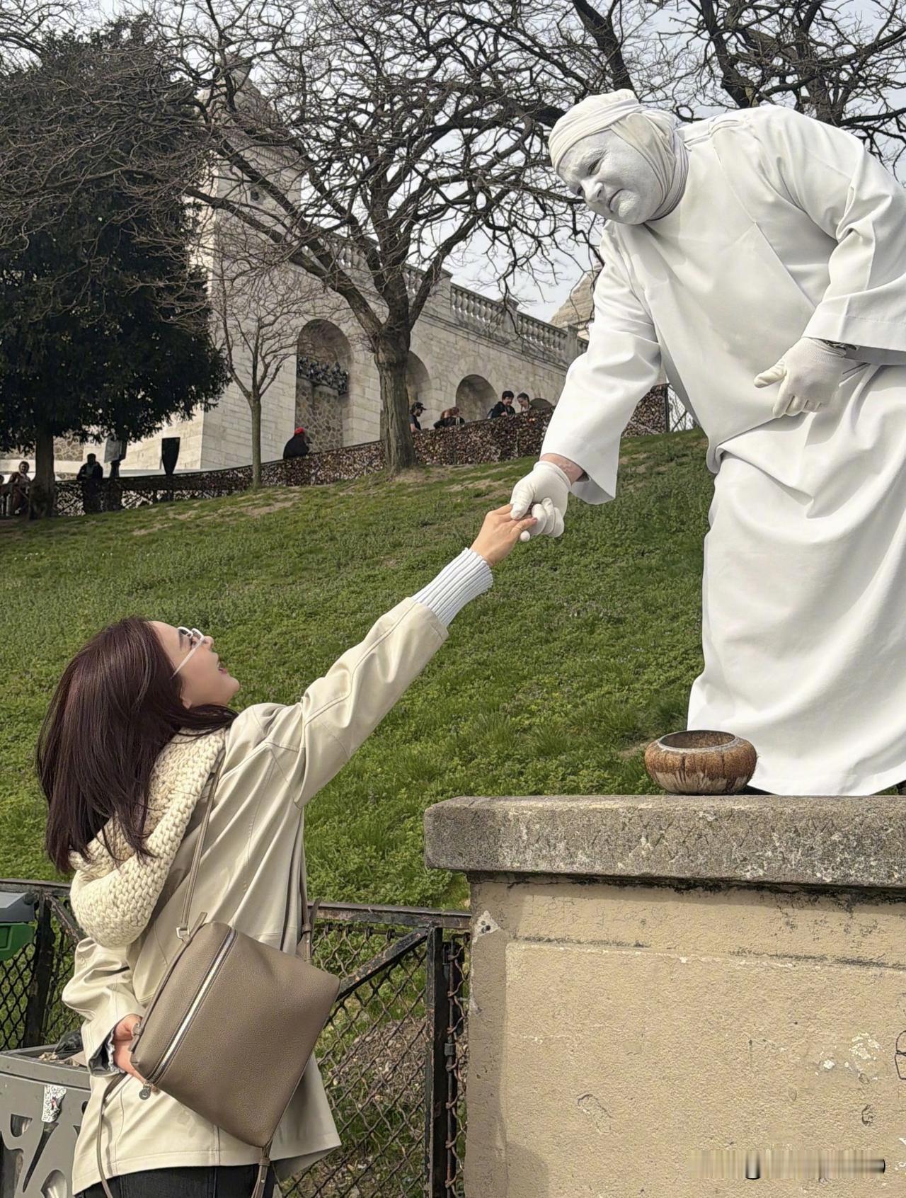 袁姗姗走在巴黎的街头,吃喝玩乐好不惬意,第一张肖像画居然画的是她,真是一点没看出来,太抽象了,没有本人美甚至有点丑,不知道还以为画的是凤姐,不过她本人感觉很喜欢。第二张的白色雕塑大叔,实在太生动,不知道的还以为是真石雕,可他突然动了,把人吓一跳!袁姗姗也不忘和他互动比心握手。你别说,没结婚的女人就是状态好,快40岁的她,看起来最多三十岁!