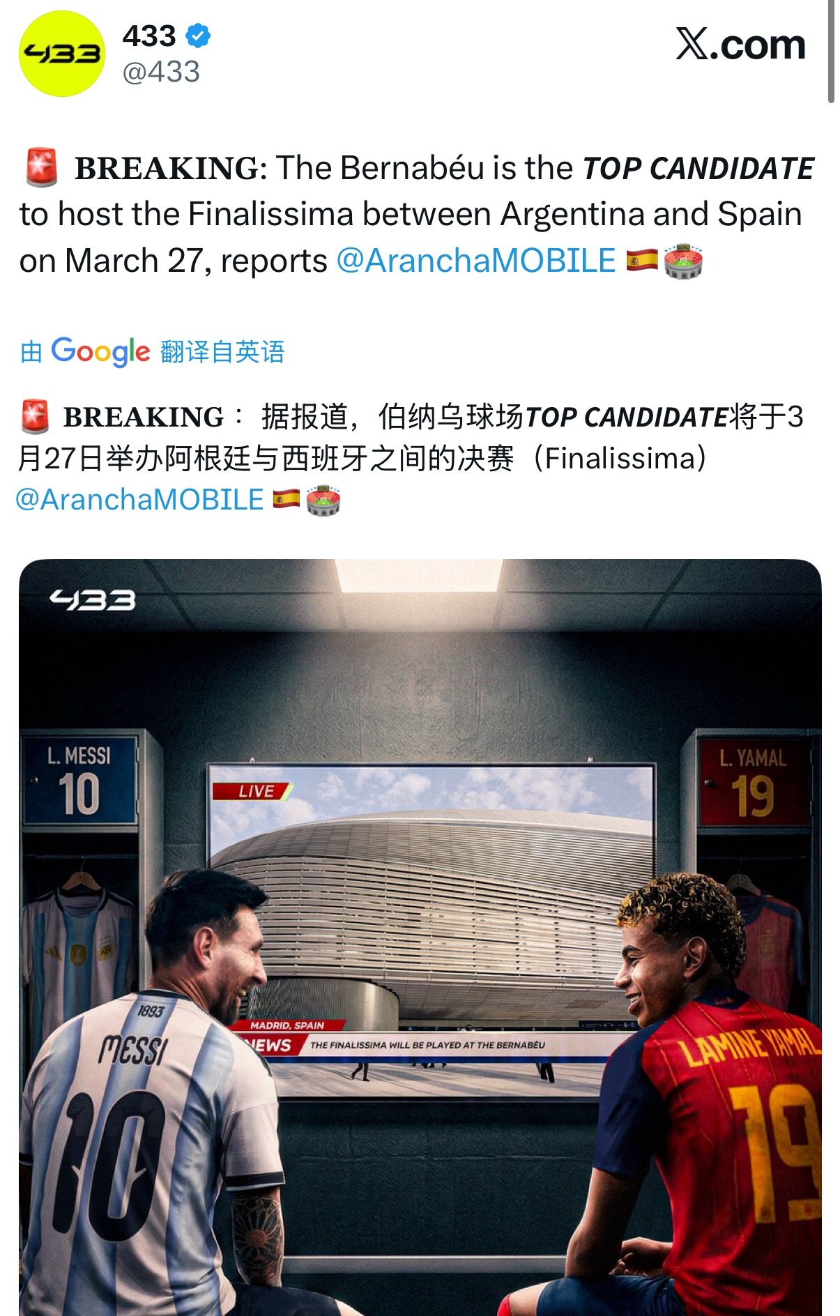 有传闻,欧美杯将在伯纳乌举办。Gaston Edul刚更新了社媒,“阿根廷足协不