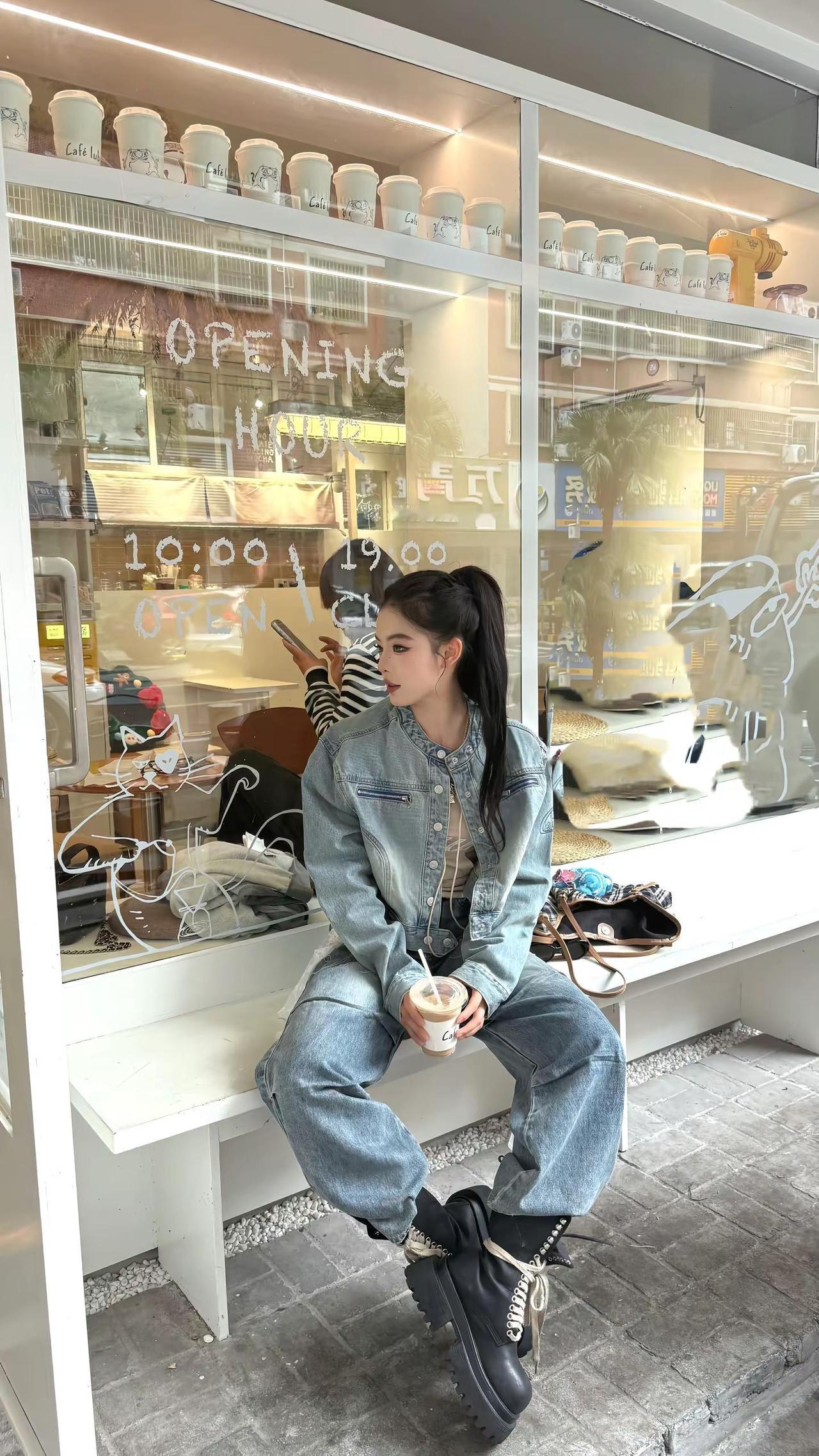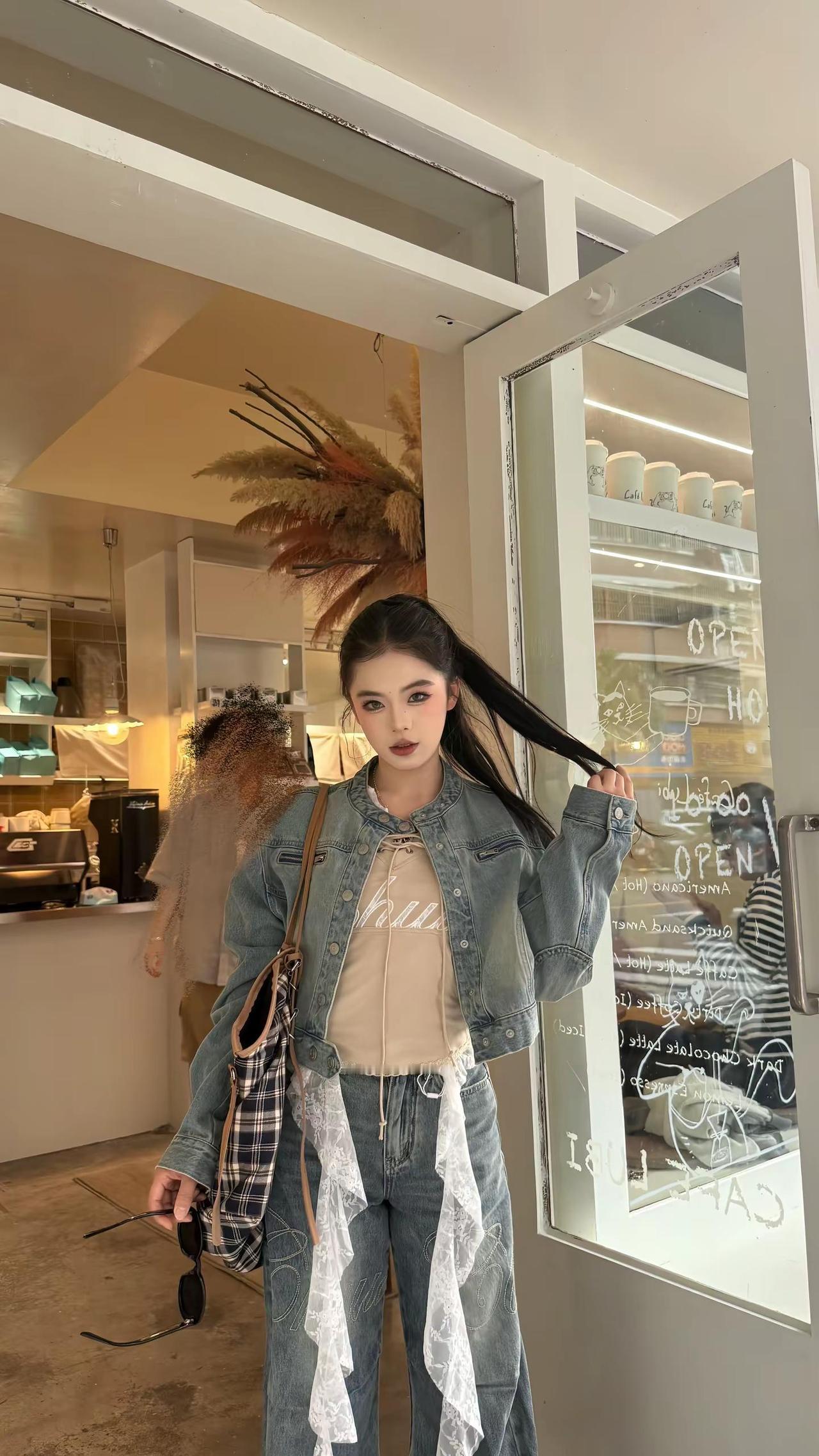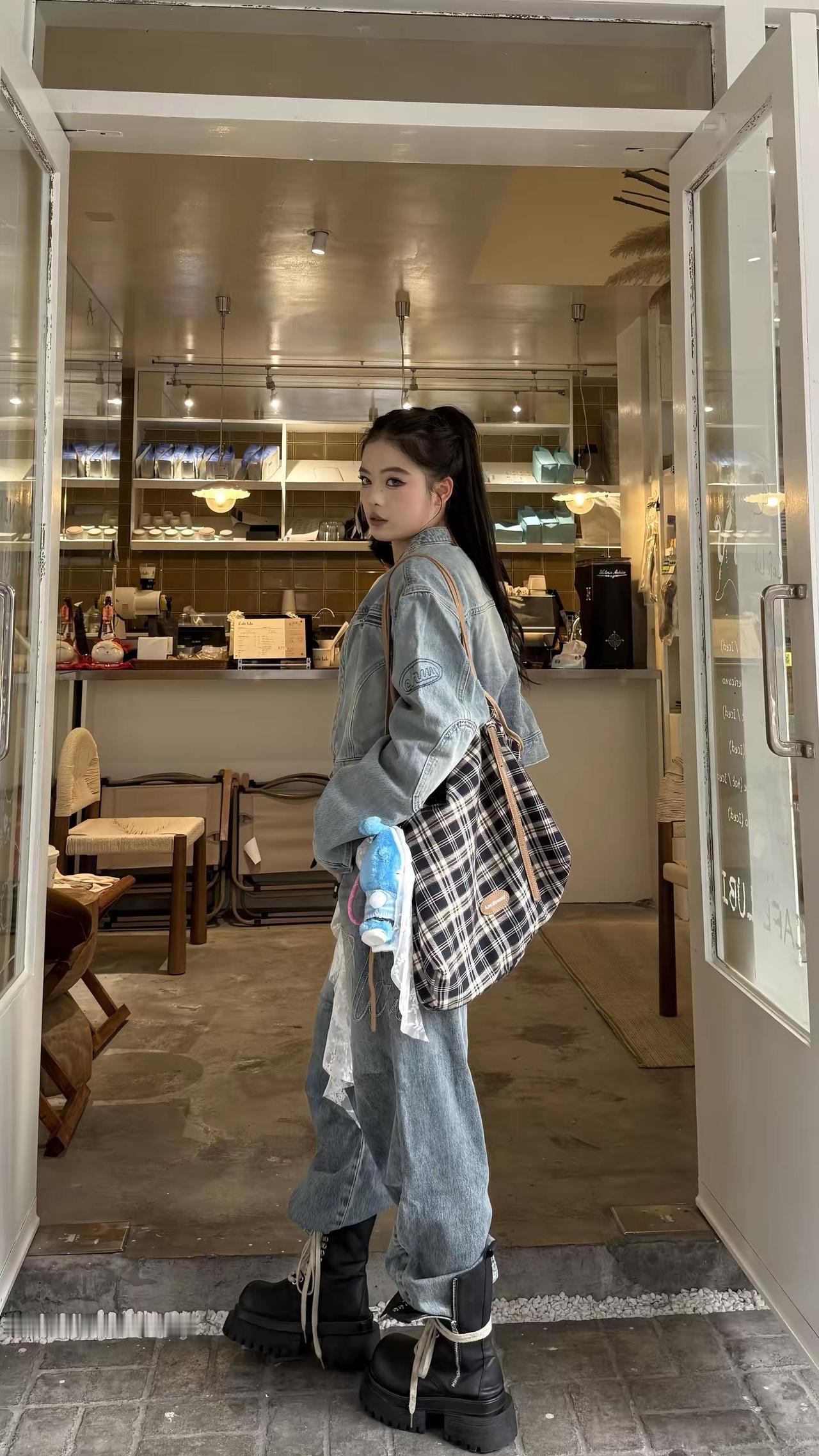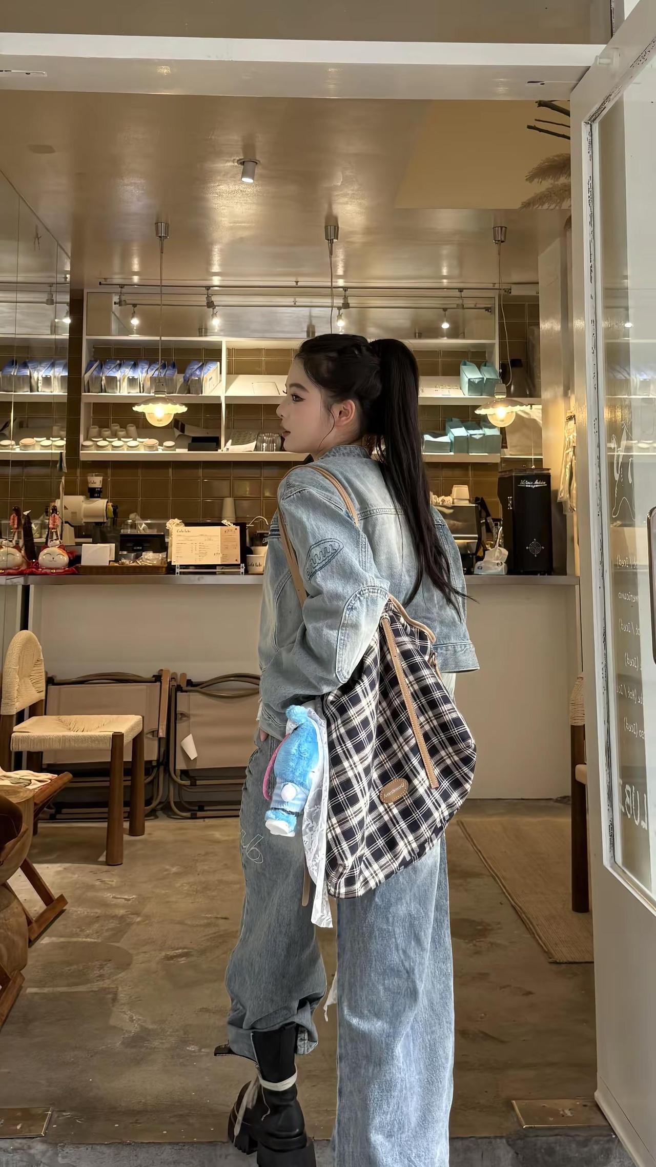 红墙前的时尚背影,牛仔与长发的完美结合