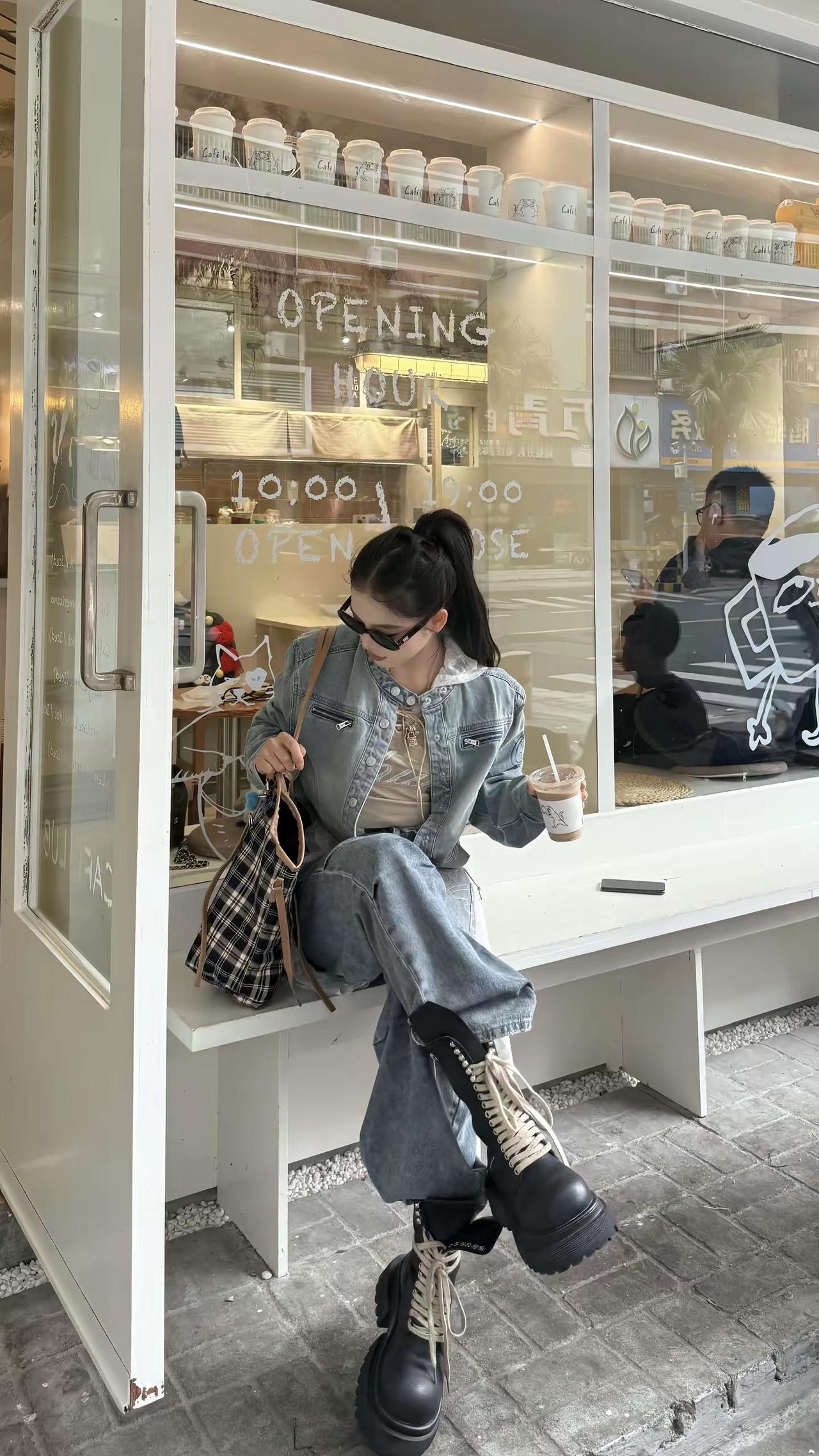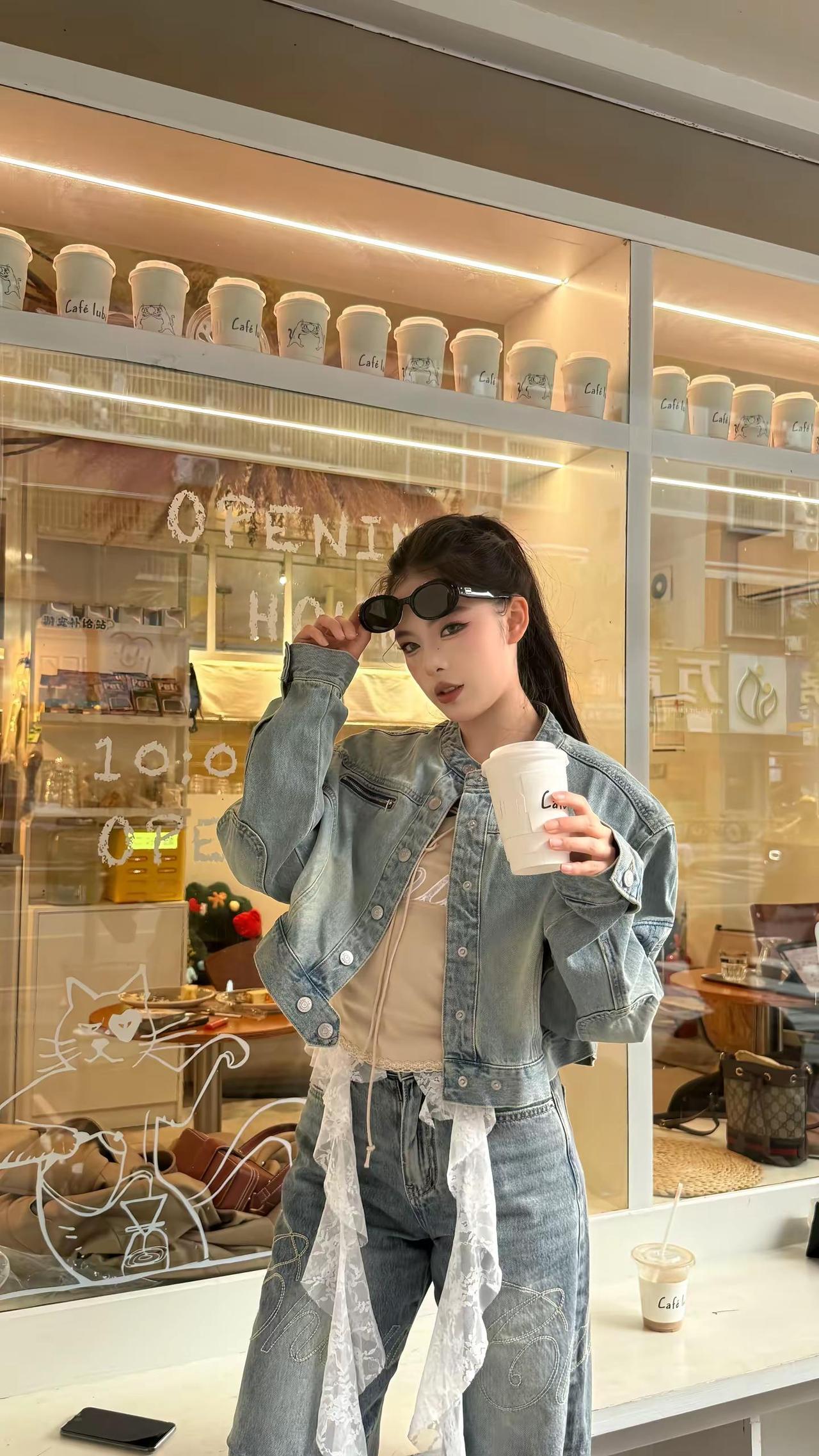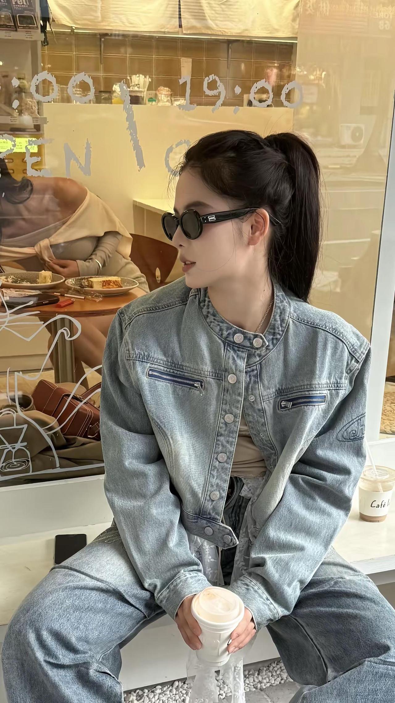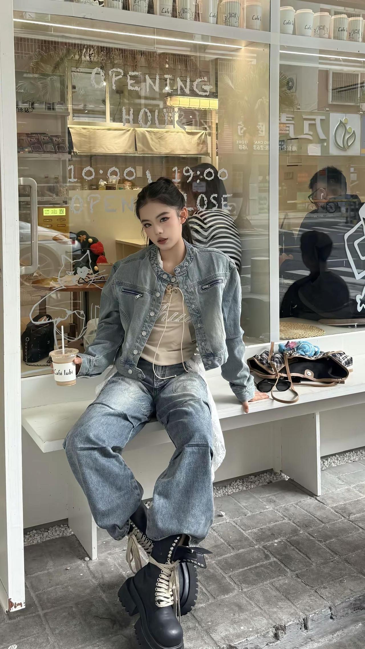 红墙前的时尚背影,牛仔与长发的完美结合