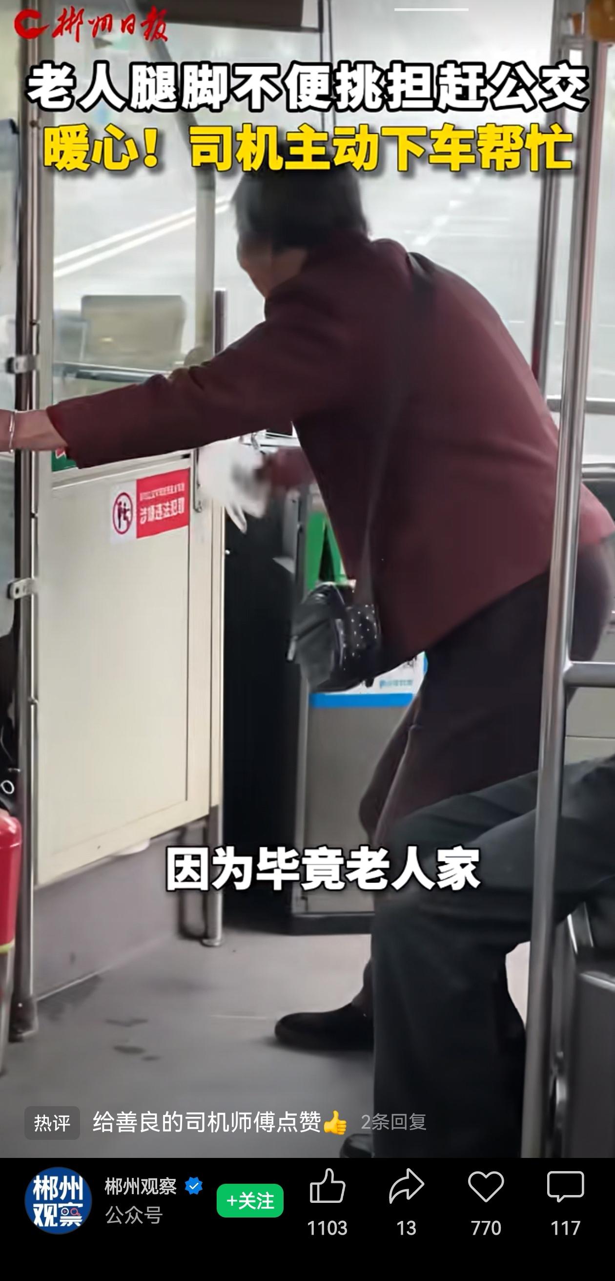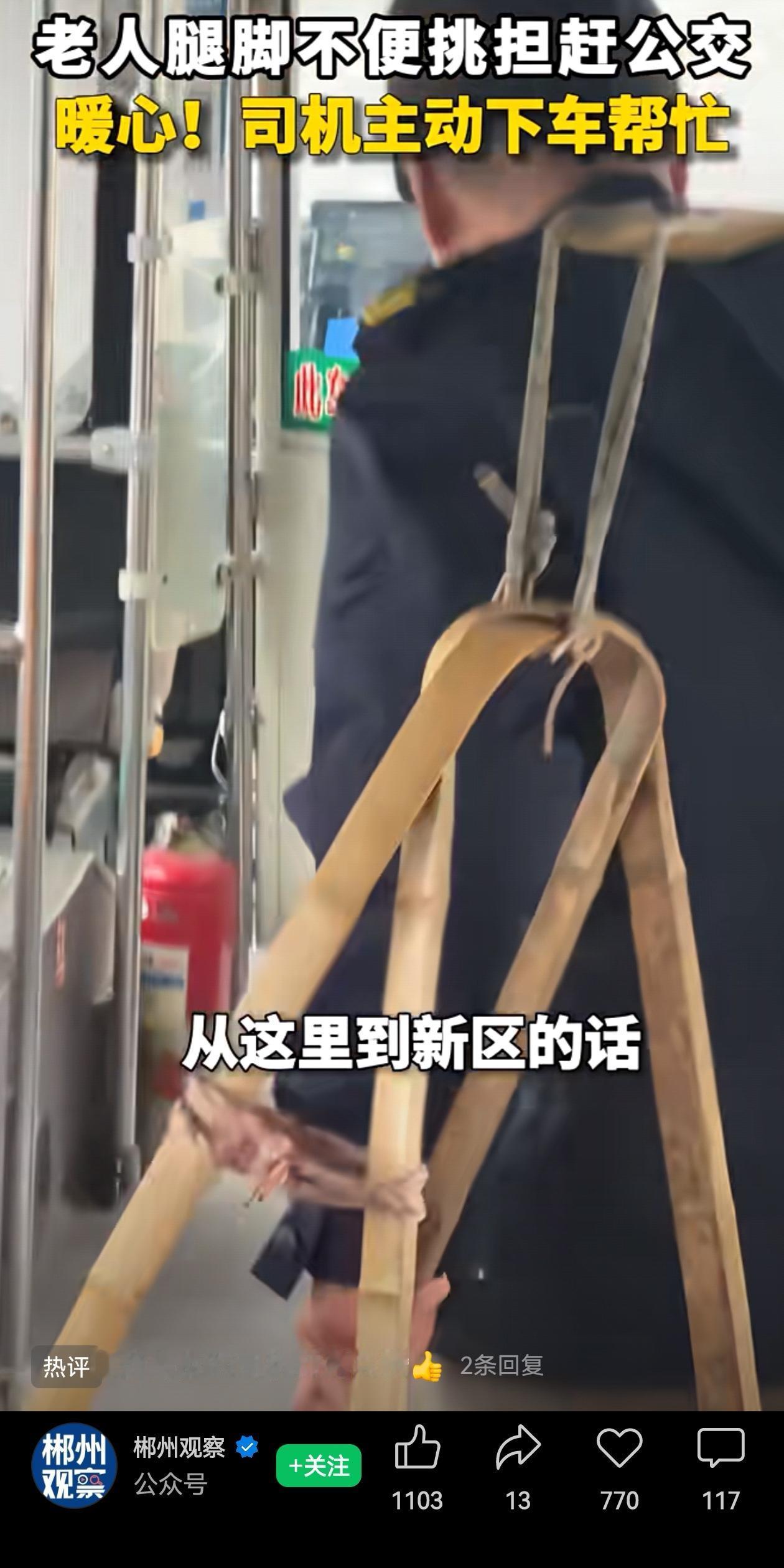 给郴州资兴司机点赞!郴州资兴的公交司机李靖宇,就用一个再普通不过的早晨,给咱们上了一堂生动的“暖心课”。 李靖宇上午九点,在公交车靠站时,看到一位腿脚不方便的老妈妈,挑着担子,艰难想赶公交。 李师傅知道,赶不上上他的这趟车,老妈妈要赶一公里的路,得走将近一个小时。 李师傅心里着急,等着老妈妈过来,但是车上有乘客在等,乘客也着急。 这种情形下,李师傅没有嫌老人动作慢耽误时间,也没按喇叭催促,而是不再犹豫,跟乘客简单说明了一句,跑下车,跑到老妈妈面前一把接过担子,挑着老妈妈担子跑上了车! 李师傅的动作有多自然,他的心就有多善良啊!没有因为每天重复同样的路线,面对成百上千的乘客,变得淡漠。而是看见了老人的艰难,搭了把手!他不只是帮老人省了力气,更重要的是维护了老人的尊严。 网友纷纷给李师傅点赞,赞的是他那份将心比心的体贴。哪家没有老人?哪个没有老去的那一天?谁都希望在步履蹒跚、提着东西赶路的时候,能被这个世界温柔以待吧? 李师傅做的这件事,就像一束微光,不仅照亮了那位老人的路,也让看新闻的人,心里跟着亮堂了一下。 公交车上的一次等候,一次搀扶,一次担子的交接,传递的都是善意。其实这世间的温暖,往往就藏在这些不经意的细节里。 希望咱们身边这样的好心人多一点,也希望这份善意,能像公交车一样,一站一站地传递下去,温暖这座城市的每一个角落。 给郴州资兴司机点赞! 信息来源:郴州观察