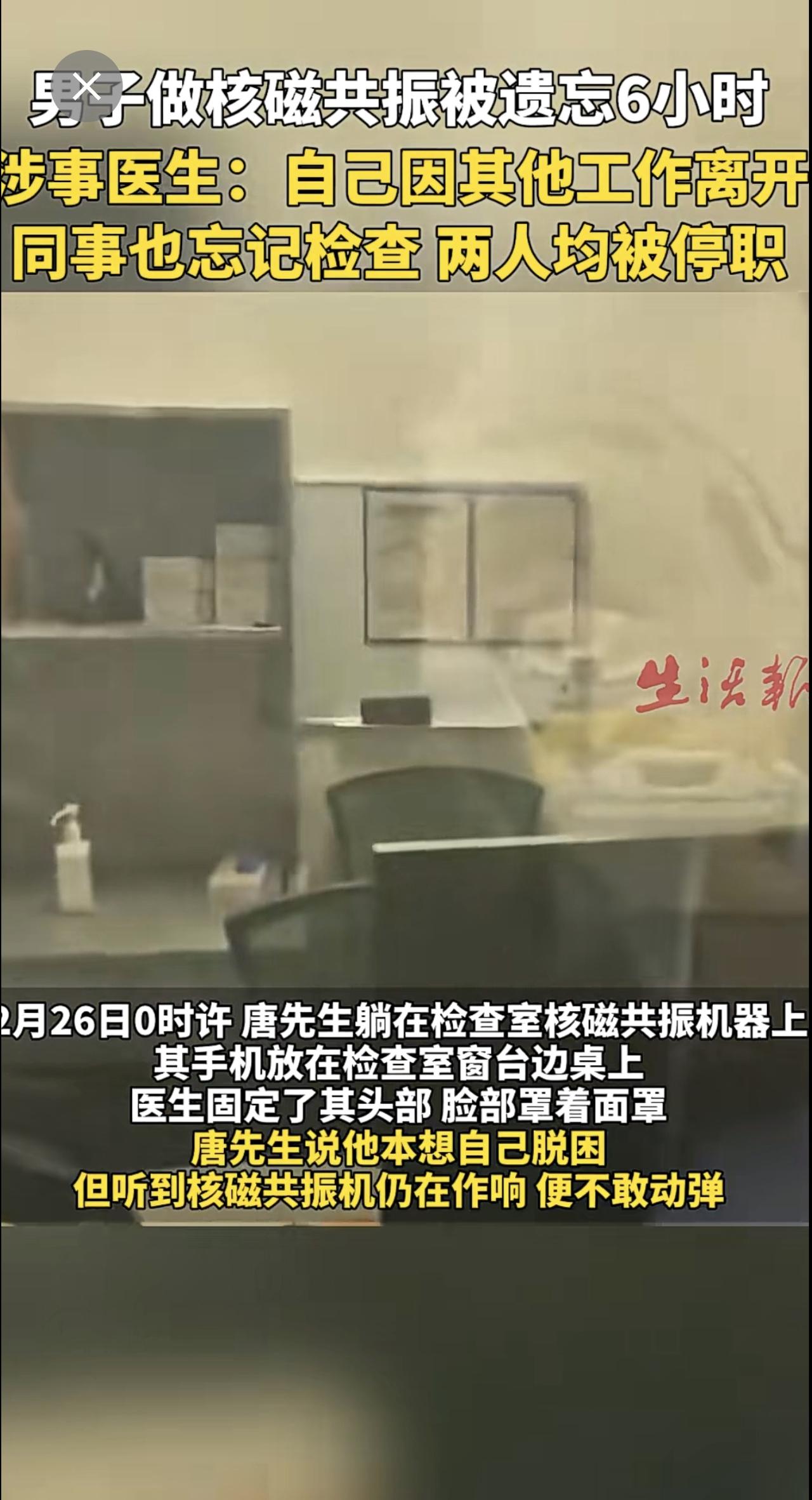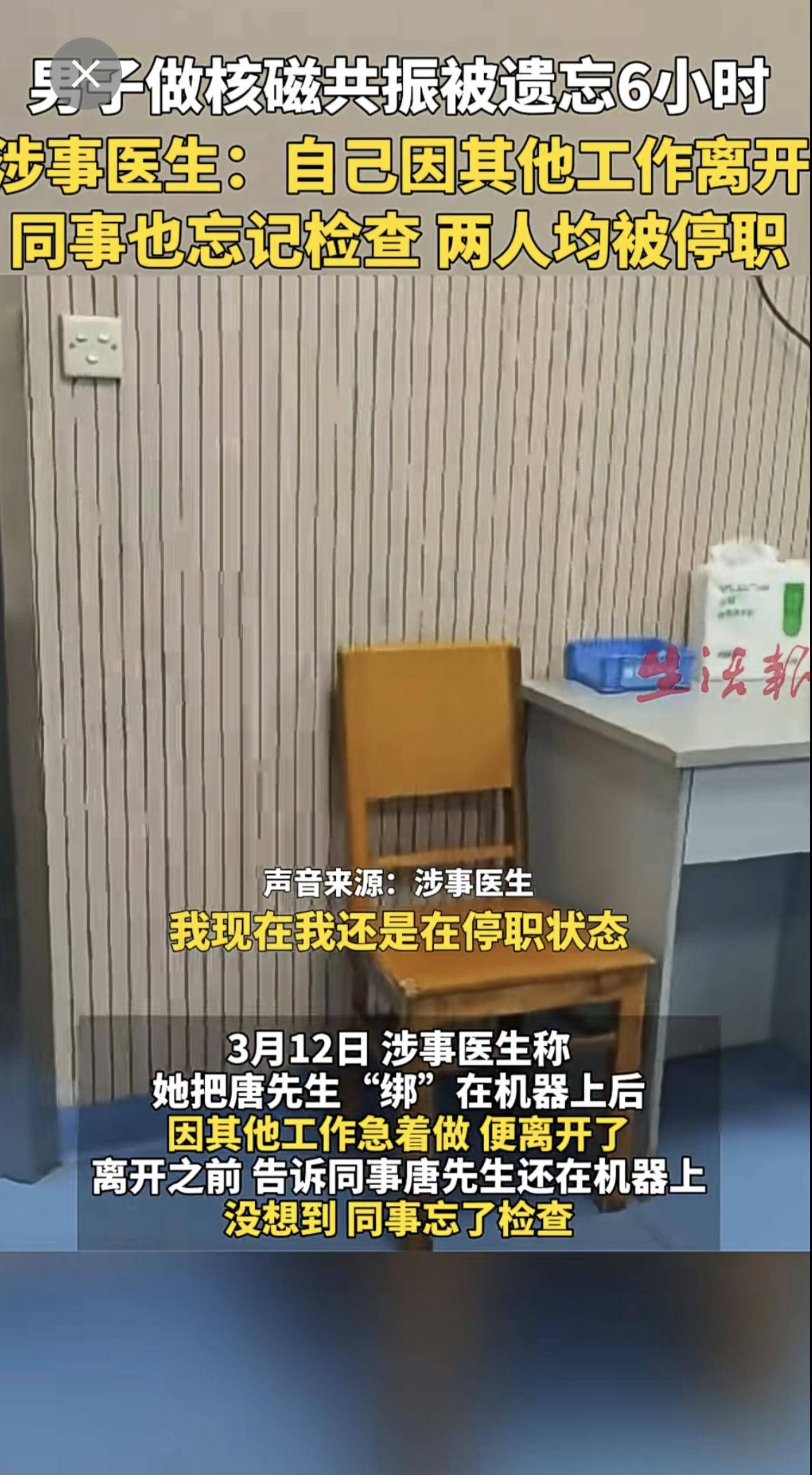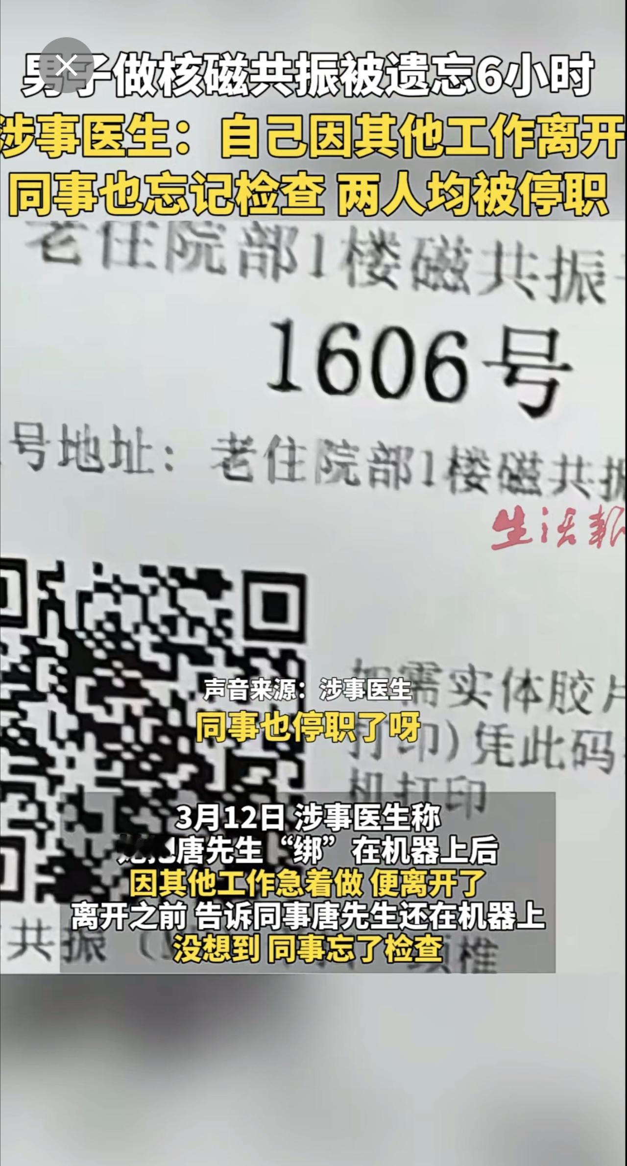 男子做核磁共振被遗忘6小时,涉事医生:自己因其他工作离开,同事也忘记检查 两人均被停职