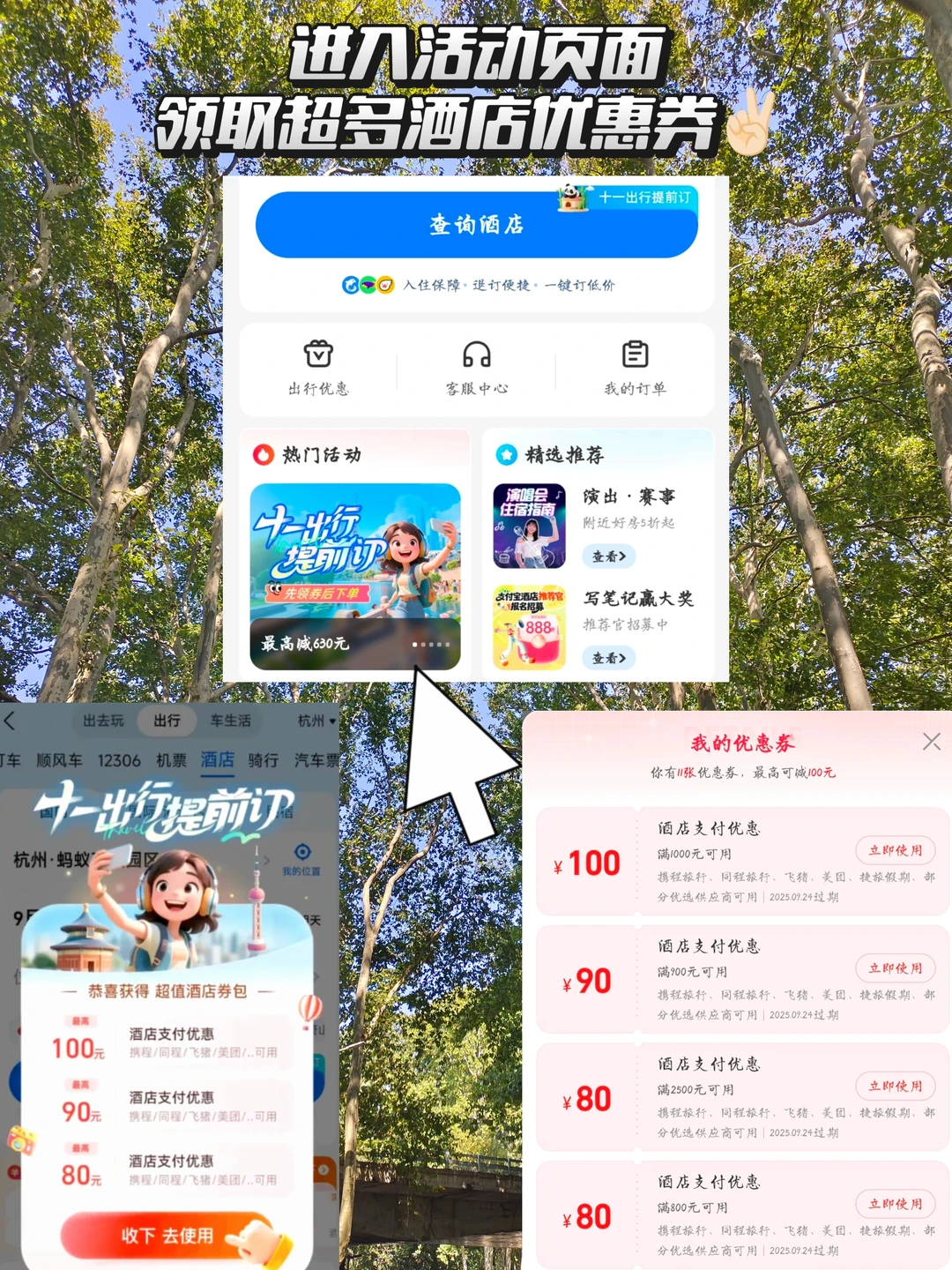 3⃣️点击“国庆中秋提前订”领取超多的酒店优惠券,订酒店时可以用来抵扣部分现金,直接省下大几十👍🏻