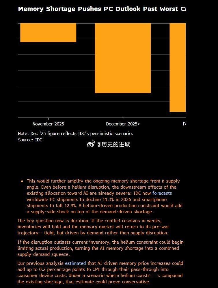 文章指出,若氦气中断持续超过数周,可能将AI驱动的内存短缺转变为供需双重挤压,进一步推高内存价格并传导至消费端CPI。IDC已预测2026年全球PC出货量下降11.3%、智能手机下降12.9%,氦气约束若叠加现有短缺,这一悲观预期可能进一步恶化。海外新鲜事