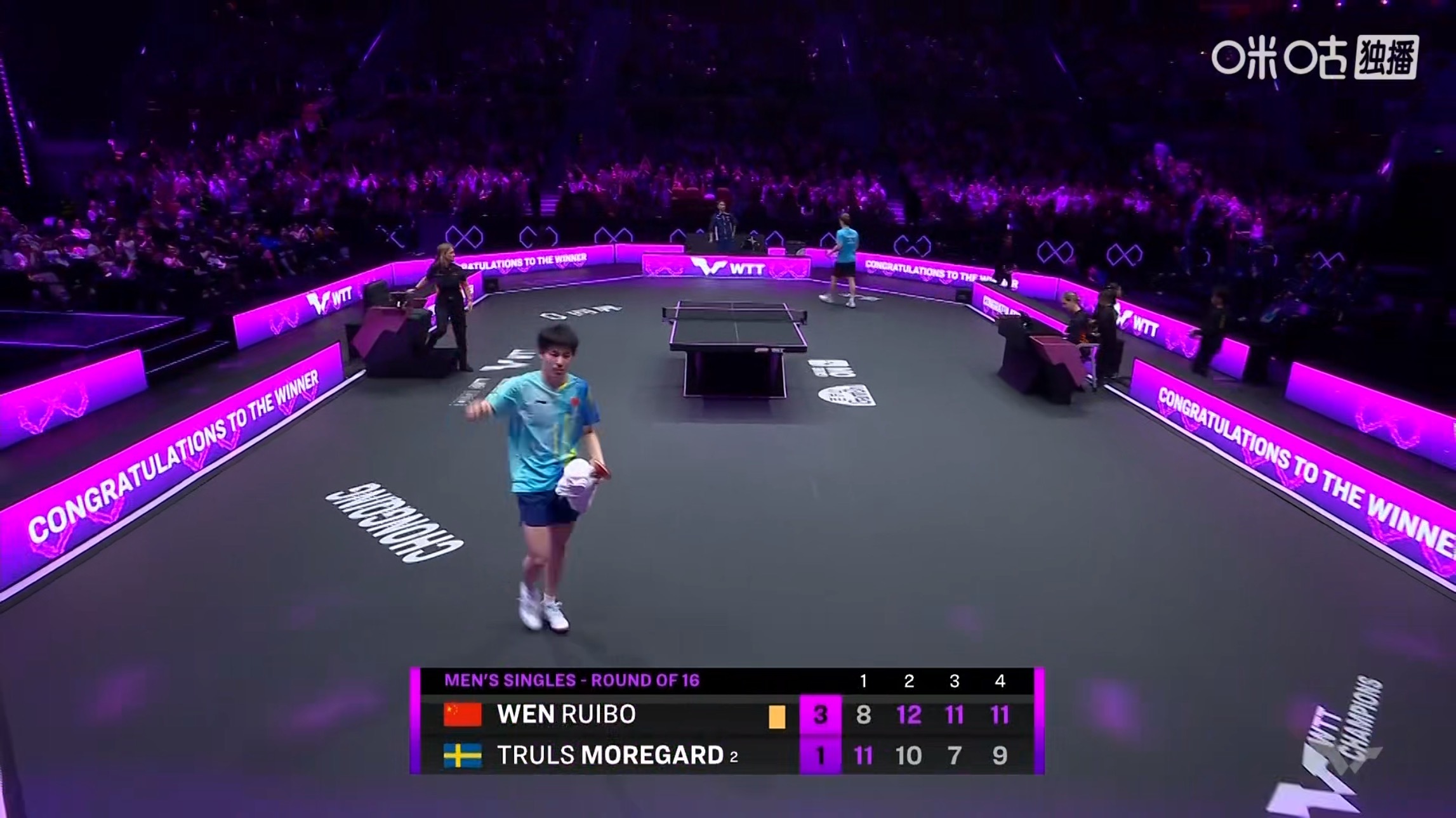 温瑞博3比1莫雷加德(8-11,12-10,11-7,11-9)晋级WTT重庆冠军赛男单8强
