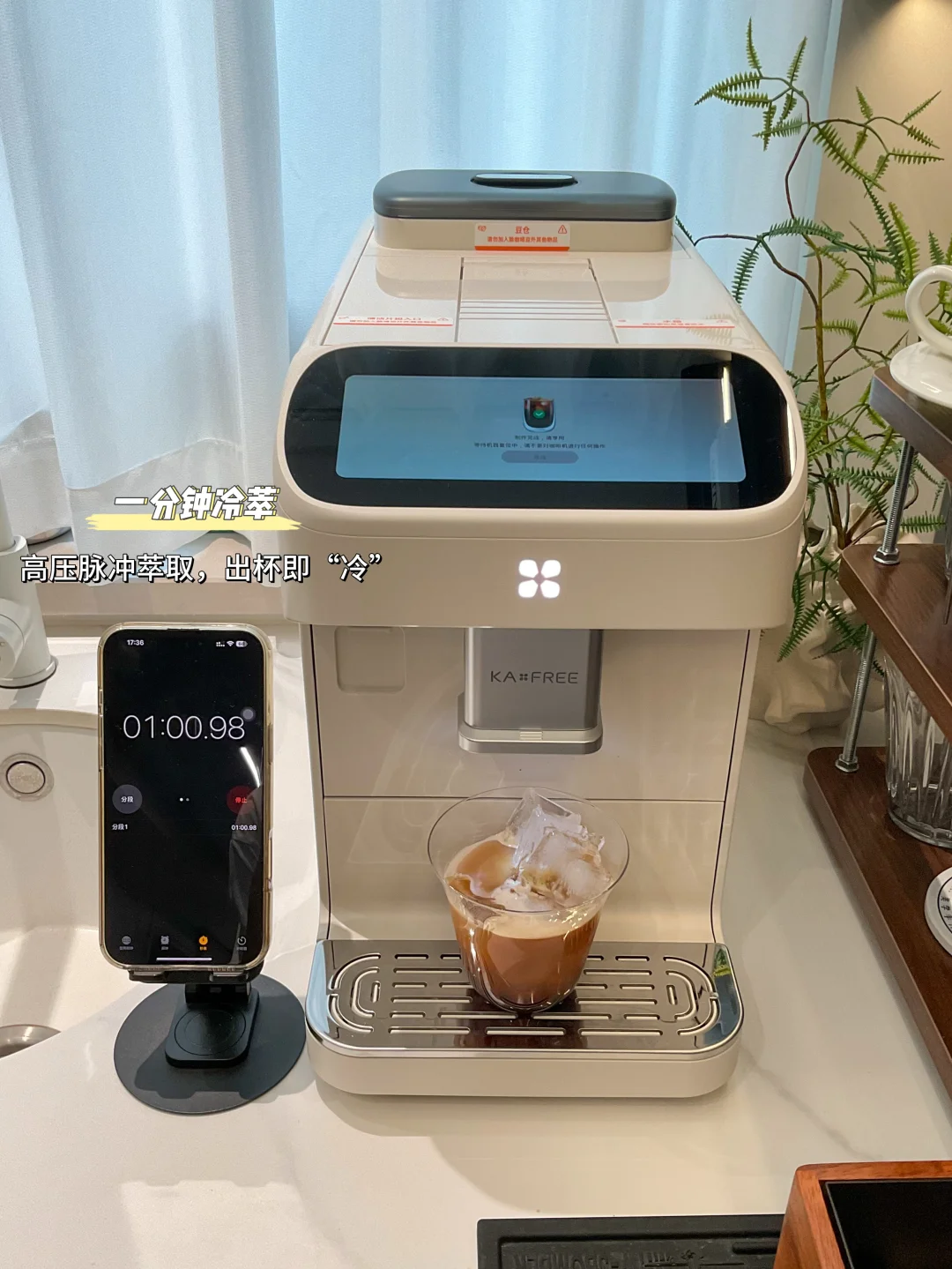 这个咖啡机采用高压脉冲萃取,制作一杯冷萃咖啡只需1分钟。独家专利的一体奶罐设计,可以制作冷热奶沫,口感绵密丝滑。