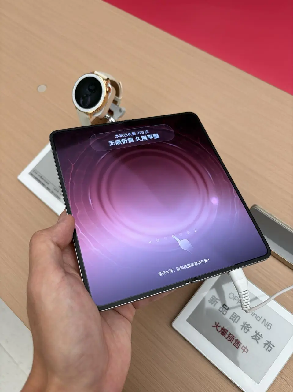 这几天听说又有新的折叠屏要出了就去门店凑个热闹,去的时候就看到有人把四台折叠屏手机凑在一起,也不知道其他三台是谁家的,反正一对比就显得OPPO Find N6跟平板似得没啥折痕,难怪有人喊它无印良品,搞得我一下就想买了!