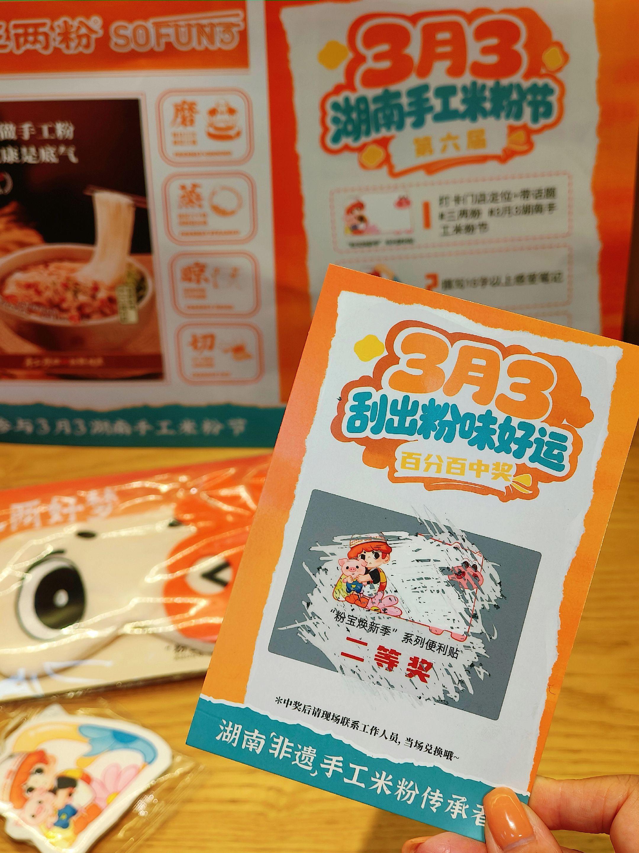 三两粉的惊喜,不止一碗粉🍜 过来昌岗吃土猪粉了,刚好赶上湖南手工米粉节。进门就看到刮刮卡活动,说是全国门店都在玩,随手刮了一张——我竟然中了二等奖!领到了定制的便利贴,这种小幸运来得刚刚好✌️ 站在玻璃窗前看厨师们👨🍳现磨现蒸,那份对“当天现做”的坚持,确实让人放心。 点了老长沙手工土猪肉粉,汤底醇厚,米粉吸饱了汤汁依然Q弹,土猪肉也嫩。再来份老长沙臭豆腐,外皮酥脆,咬开灌满辣汁,还是记忆里的味道😋 顺带薅了把12道免费配菜,酸豆角加了两大勺,满足。吃饱喝足,带着小周边回家咯~