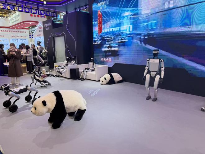在京东展台,宇树科技首发了京东定制版的R1蓝白色人形机器人,镜识科技展示了可在人形与狗形间切换的BaoBao机器人。