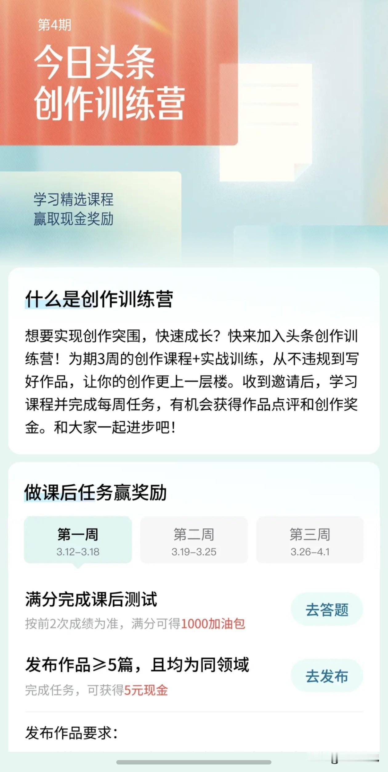 收到“微头条小秘书”的私信,说看我最近发文积极、内容有潜力,特地邀请我参加一个为期3周的“官方创作训练营”。说实话,第一反应是“这不会是群发的吧?”但点开详情一看,课程安排、任务节点、奖励机制都列得清清楚楚——第一周3.12-3.18,满分完成课后测试能拿1000加油包;第二周3.19-3.25,发布5篇同领域作品还能再拿5元现金。虽然钱不多,但这种“有目标、有反馈、有奖励”的机制,对想认真写点东西的人来说,简直是量身定制。 我觉得这个训练营最值的不是奖励,而是“逼自己一把”的机会。现在很多人写东西都是“想到哪写到哪”,缺乏系统性,而这个训练营明确要求“同领域持续输出”,这其实是在帮我们建立内容壁垒——你越深耕一个领域,粉丝越容易记住你,平台也越愿意推你。而且它强调“实战+课程”,不是光听课,而是边学边练,这种模式比单纯看教程有效得多。 另外,页面写着“本活动仅限受邀作者”,说明平台是真在筛选活跃、有潜力的创作者,不是随便拉人凑数。这反而让我觉得,平台是想帮我们成长,而不是单纯为了拉新。如果你也收到了邀请,别犹豫,点进去看看。反正不花钱,还能学点干货,万一真能写出点名堂呢?毕竟,写作这事儿,贵在坚持,也贵在有人带。
