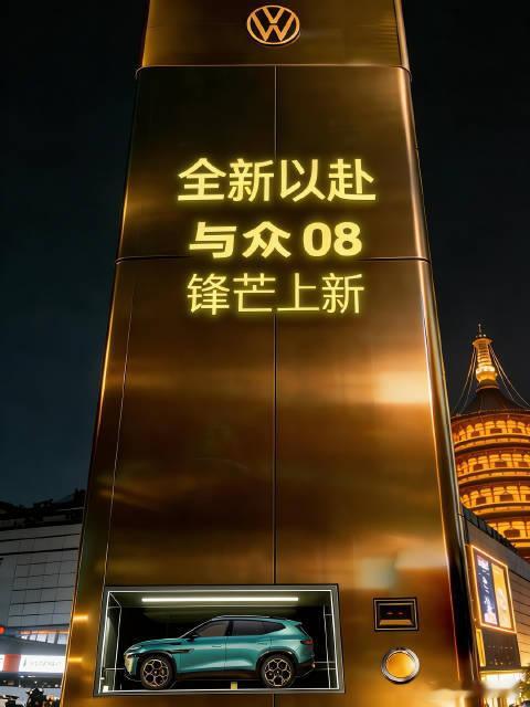 锋芒上新全新以赴大众推出ID.与众汽车贩卖机,打造城市潮流新地标,展示智能纯电新车与众08。该车采用金标设计,座舱科技感十足。金标大众与众08