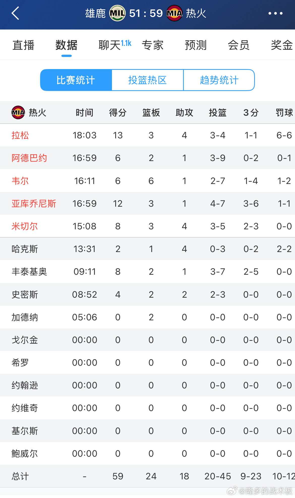 半场结束阿德巴约6分2板1助,热火59-51雄鹿雄鹿vs热火