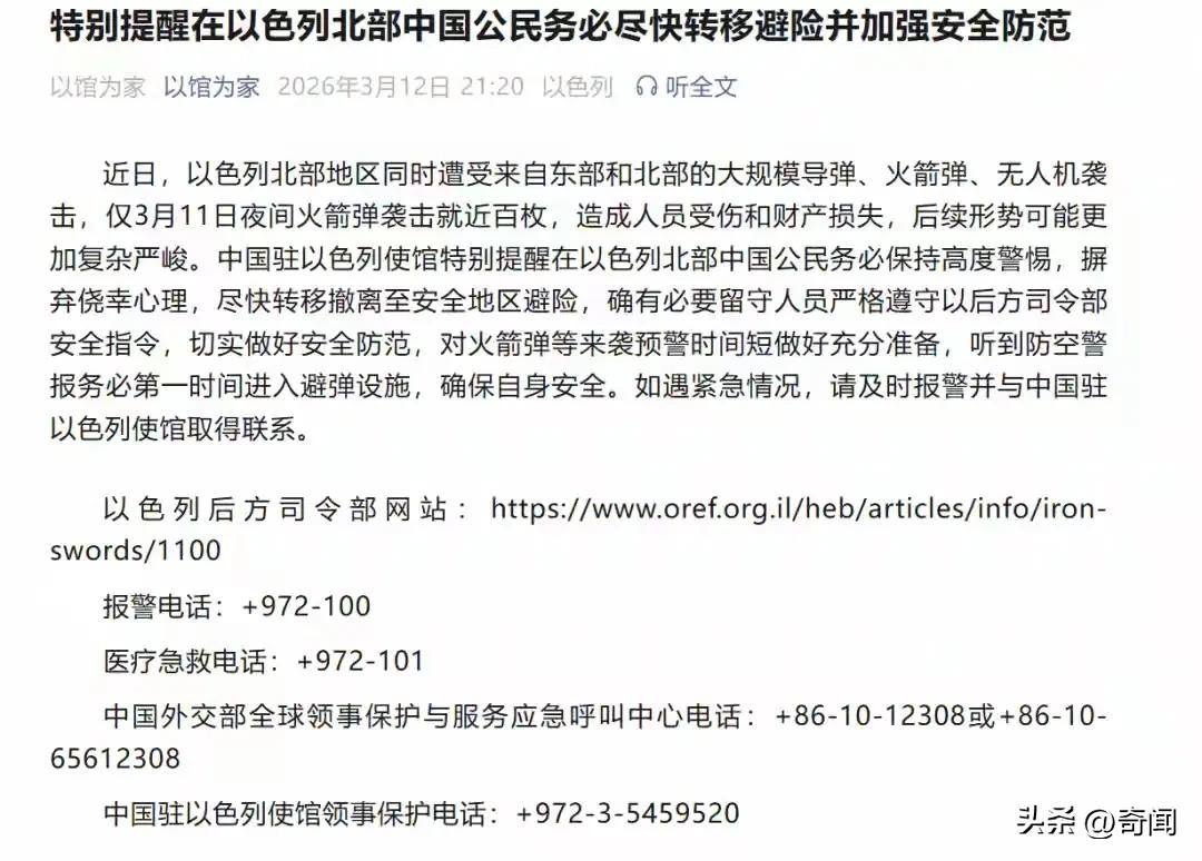 外交部发布撤离提醒,以色列北部可能遭到大规模军事打击。3月12日晚上,中国外交部大使馆根据近期局势和消息,判断黎巴嫩真主党可能再次对以色列北部区域发起火箭弹和炮弹攻击,提醒在以色列务工和旅游的中国市民,应该尽快离开危险区域。 如果实在无法离开,在听到防空警报后应立即转移到避难所或者地下掩体,听从以色列军方司令部的指挥和安排,不要冒险拍摄现场视频,在街道和危险区域逗留,避免遭受财产损失和人身伤害。 以色列出大事情 外交部提醒以色列北部中国市民撤离