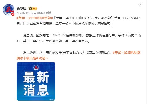 突发新闻——美军KC-135在伊拉克上空被击落。消息来源——德黑兰时报补充消
