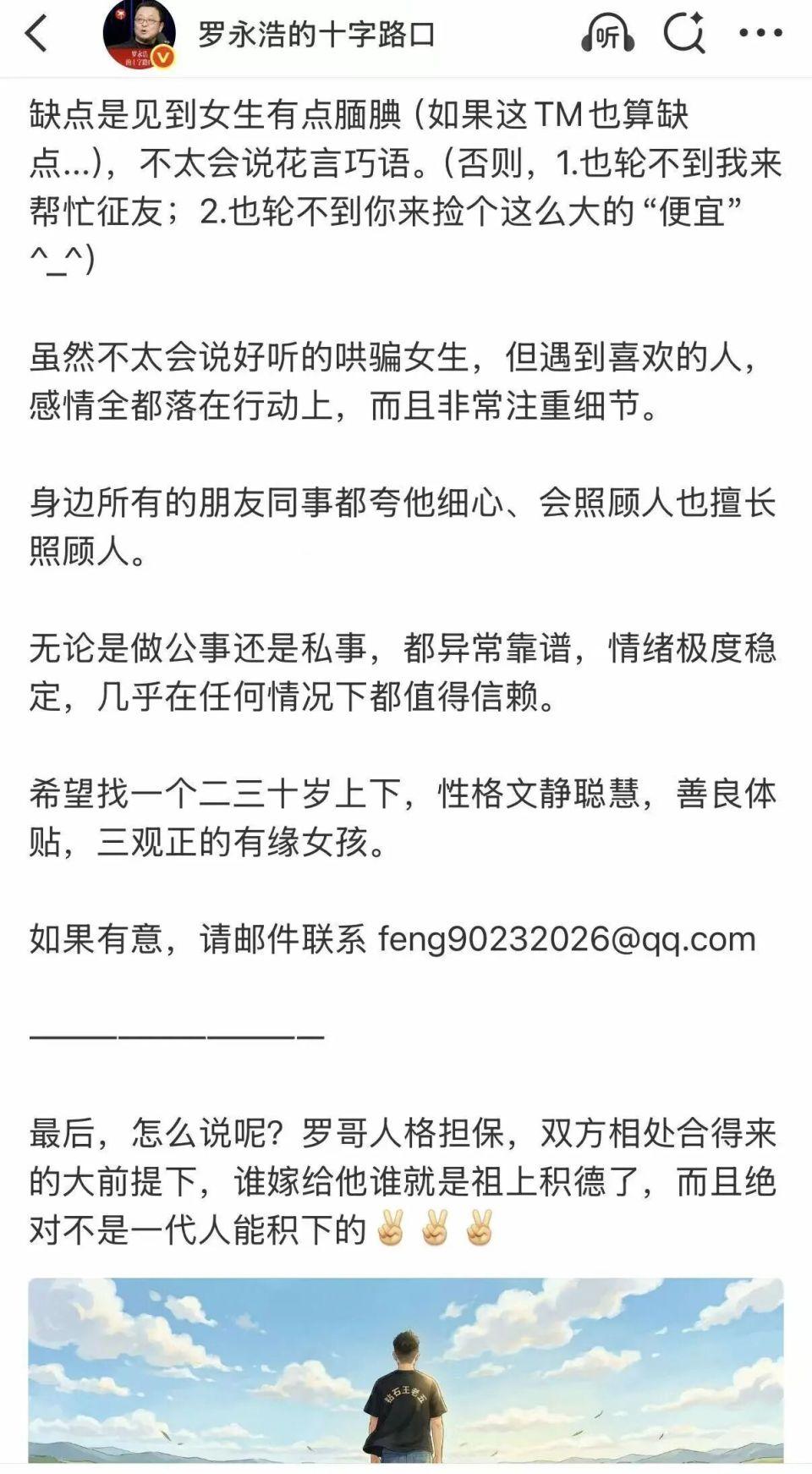 万万没想到!罗永浩"改行"当月老了! 罕见!罗永浩居然公开为前锤男同事在线征对象,找新娘,说学逗唱样样会,心地还善良,这个老板,你人还怪好呢