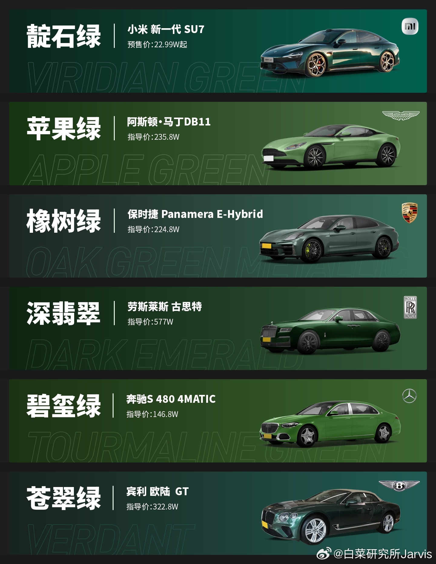 好了,现在9款颜色全部露脸了,你更喜欢哪个颜色呢?其实上一代的橄榄绿就已经很圈粉了,还推荐我的好朋友买了那个颜色,所以这一代里,要让我选的话肯定是靛石绿了,偏爱。大v聊车 新一代SU7靛石绿