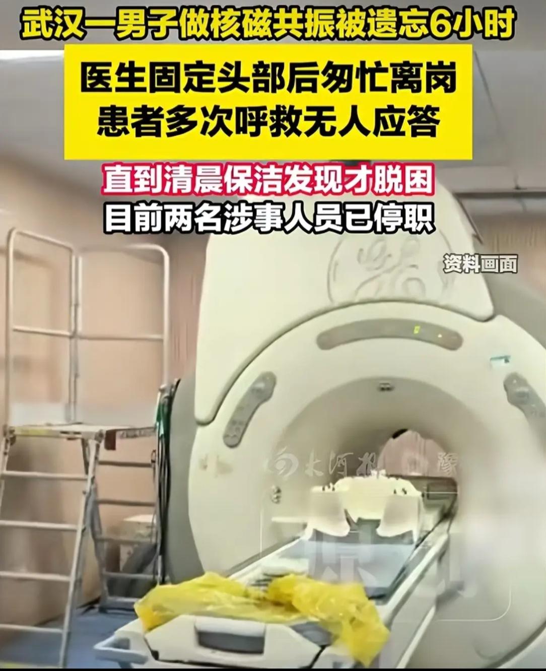 要不怎么说医疗机构的事从来都不是小事,人命关天啊!说实话,我不敢相信一个患者,会被固定住头部,关在核磁共振机里长达六个小时,喊天天不应,喊地地不灵,还是保洁阿姨救了他。 这得是心多大,多没责任感才会发生这样的事。“涉事两名医护人员”只是停职?这显然是严重的医疗事故,自罚一杯肯定过不去。