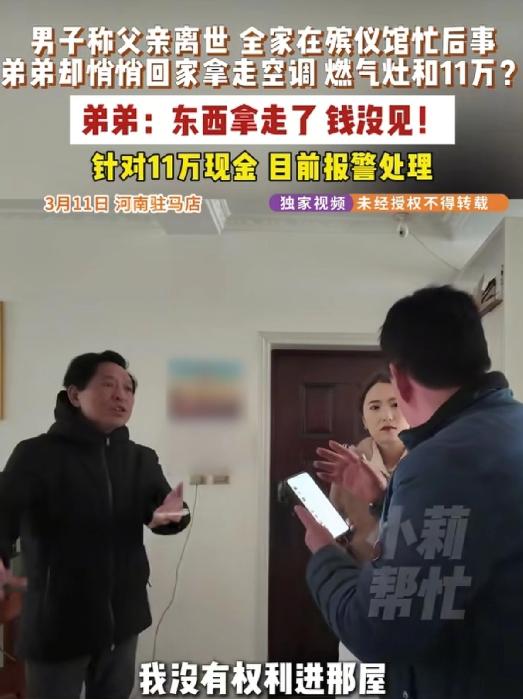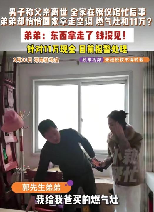 脸都丢尽了!河南驻马店,男子父亲肺癌去世,全家人都在殡仪馆里,哭得昏天黑地,忙活老人的后事,谁知弟弟却一声不响,直奔男子家里,拆走了家里的空调、燃气灶,还拿走了抽屉里,自己和父亲攒下的11万元现金。男子回去一看家被偷了,瞬间气炸,质问弟弟为何如此自私。弟弟拍着胸脯表示:东西是我出钱买的,确实是我拿走的,但钱没见。双方争执不下,选择报警。 父亲前脚刚因肺癌撒手人寰,原本这应该是全家人最该抱团取暖、共渡难关的时候,可谁能想到,河南驻马店的郭先生,一边在殡仪馆忙得焦头烂额,一边却被自己的亲弟弟狠狠捅了一刀。 这事说出来都让人觉得寒心,活生生的一出家庭伦理大戏,让无数网友看了都气得牙痒痒,直呼这亲情在钱面前怎么就这么不值钱。 郭先生家里兄妹四个,他排行老二,这些年,老爷子身体不好,一直都是郭先生在身边伺候着,端屎端尿那是常事。 至于那个弟弟,平时也就是个甩手掌柜,难得露个脸,更别提尽什么孝心了,上个月,老爷子没熬过病魔,走了。 这一走,全家人都像是被抽了魂,赶紧都聚到殡仪馆,想着怎么把老爷子的后事办得风风光光,让他走得安详点。 那几天,殡仪馆里哭声一片,大家忙里忙外,脚不沾地,谁也没那闲工夫去盯着谁,更没想到那个平日里不怎么露面的弟弟,竟然在这个节骨眼上动起了歪心思。 他既没在灵前给老爹磕头守灵,也没帮着哥哥处理那一堆乱七八糟的琐事,反而趁着大家都忙得不可开交的时候,偷偷溜回了郭先生家。 这弟弟对哥哥家那是熟门熟路,摸出钥匙开了门,还叫了帮手,二话不说就开始拆家,墙上的空调、厨房里的燃气灶,那是卸得干干净净,就连抽屉里放着的现金都没放过。 等到郭先生一家人拖着疲惫的身子回到家,推门一看,直接懵了,家里跟遭了贼似的,墙上留着空调管的大洞,灶台上也是空荡荡的,一片狼藉。 郭先生心里“咯噔”一下,赶紧冲到卧室拉开那个放钱的抽屉,好家伙,里面那是比脸都干净!那可是他和父亲省吃俭用攒下来的11万块钱啊,全没了! 那一瞬间,郭先生只觉得脑瓜子嗡嗡的,悲痛劲还没过,怒火又窜上来了,他浑身都在发抖,想都不用想,这肯定是那个“好弟弟”干的,除了自家人,谁知道钥匙在哪?谁知道钱放哪?他立马给弟弟打电话,让人过来对质。 面对哥哥那要吃人的眼神,弟弟倒是淡定得很,一点愧疚的意思都没有,他拍着胸脯承认,空调和燃气灶确实是他拆走的,理由也很“充分”:那是他当初买的,现在拿回来天经地义,但一提到那11万块钱,他立马把头摇得跟拨浪鼓似的,一口咬定自己没见过,更没拿过。 郭先生哪能信他的鬼话?那钱一直是放在家里的固定位置,除了自家人没人知道,弟弟趁着家里没人,上门拆家电、翻箱倒柜的,这时候钱正好没了,你要说跟你没关系,鬼都不信!郭先生指着弟弟的鼻子骂他自私透顶,爹刚走尸骨未寒,不想着尽孝,反而忙着抢东西、偷钱,这哪还有半点兄弟情分?简直就是没人性! 两兄弟就在那吵得不可开交,谁也不让谁,弟弟死咬着只拿了家电,郭先生坚信弟弟就是那个偷钱的贼。 眼看着这事私了不了,郭先生也是寒了心,不想再惯着这个白眼狼,直接报了警,既然你不仁,那也别怪我不义,让警察来查个水落石出,也好给死去的爹一个交代。 虽说现在那11万块钱到底去哪了还没个定论,案子还在查,但弟弟趁着办丧事去哥哥家拆家电这事,那是板上钉钉的。 这事一传出去,十里八乡的邻居们都在背后戳脊梁骨,这段本来就脆弱的兄弟情,算是彻底断了。 这事被发到网上以后,网友们也是炸了锅,大家都骂这弟弟太不是个东西,太冷血了,亲爹死了都不难过,光想着怎么捞好处,连亲哥的东西都抢,亲爹的棺材本都惦记,这做人的底线都被他踩碎了。 更多的人是心疼郭先生,一边伺候老爹送终,一边还得防着家贼难防,真是既伤心又寒心。 也有不少人感慨,以前总觉得亲情是这世上最靠得住的东西,可真到了钱这块试金石面前,有些亲情那是真的脆弱得像纸一样。 平时赡养老人看不见人影,一到分家产抢东西跑得比谁都快,这样的亲戚,真不如个外人,大家都盼着警察能赶紧把案子破了,让这种自私自利的人付出代价,也希望咱们都能珍惜身边的亲人,别让那点臭钱毁了最珍贵的亲情。 父亲走了已经是最大的痛了,亲人的背叛更是往伤口上撒盐,郭先生这遭遇,给咱们所有家庭都提了个醒:孝顺和善良,那是做人的根基,亲情和道义,永远比钱财重要得多,别等到真的一无所有了,才后悔当初没好好珍惜。 对此你怎么看? 信源:小莉帮忙