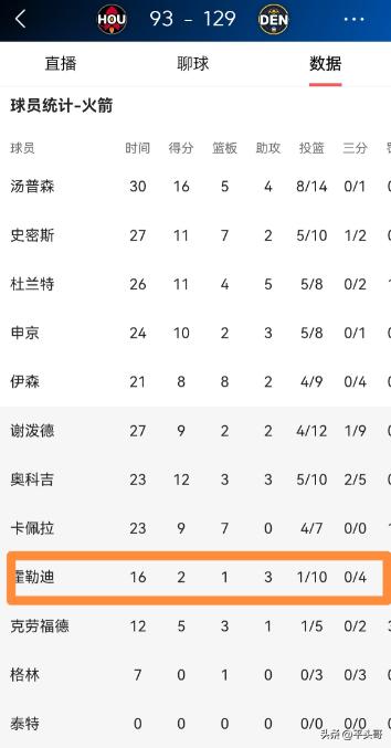 火箭大将霍勒迪的手感真是吓死人了!在昨天火箭客场以 93:129 惨败于掘金的比赛中,霍勒迪的投篮手感冰凉到了极点,他在替补出战的 16 分钟里,投篮 10 中 1,其中三分球 4 中 0 无比低效的得到 2 分,他的场上正负值为 - 17。 北京时间 3 月 12 日,火箭客场挑战掘金,最终以 93 比 129 输掉 36 分,这场西部卡位战里,替补后卫阿隆・霍勒迪的表现格外扎眼。 他替补登场打了 16 分钟,出手次数不少,但命中率低得离谱,整场下来只靠一次运动战进球拿到 2 分,三分线外更是颗粒无收。 这场比赛是火箭背靠背的第二场,球队整体状态都不好,霍勒迪的低迷只是其中一个缩影。 他上场后,进攻端始终找不到节奏,不管是中距离还是三分线外,出手后大多没能命中,给球队的进攻端拖了后腿。 作为替补后卫,他本应该在衔接段给球队提供火力支援,可这一场完全没能做到,反而因为多次投篮不中,让球队的进攻陷入停滞。 从比赛进程来看,火箭上半场还能和掘金咬住比分,分差不算大,但到了第三节,掘金突然发力,单节打出 40 比 22 的攻势,直接把分差拉开。 霍勒迪在这段时间也有出场,可他没能用得分帮助球队稳住局面,反而因为效率太低,让球队在攻防转换中更加被动。 他在场的这段时间,球队输分不少,场上正负值为 - 17,也能看出他对球队的负面影响。 霍勒迪本赛季在火箭的角色主要是替补后卫,场均出场时间不多,进攻端以投篮为主。 之前的比赛里,他偶尔能有不错的发挥,比如之前对阵骑士时,末节还能连续得分帮助球队赢球。 但这场对阵掘金,他的手感彻底冰凉,多次出手都没能转化为得分,也没能用传球或者防守弥补进攻端的不足。 这场惨败后,火箭的排名受到影响,而霍勒迪的低迷表现也成为球队失利的一个注脚。 对于火箭来说,后续的比赛需要调整状态,而霍勒迪也需要尽快找回手感,在替补席发挥出应有的作用,不然很难在球队的轮换中站稳脚跟。 以上都是个人观点,对此您有什么不同的看法,可以在评论区留言讨论!!!