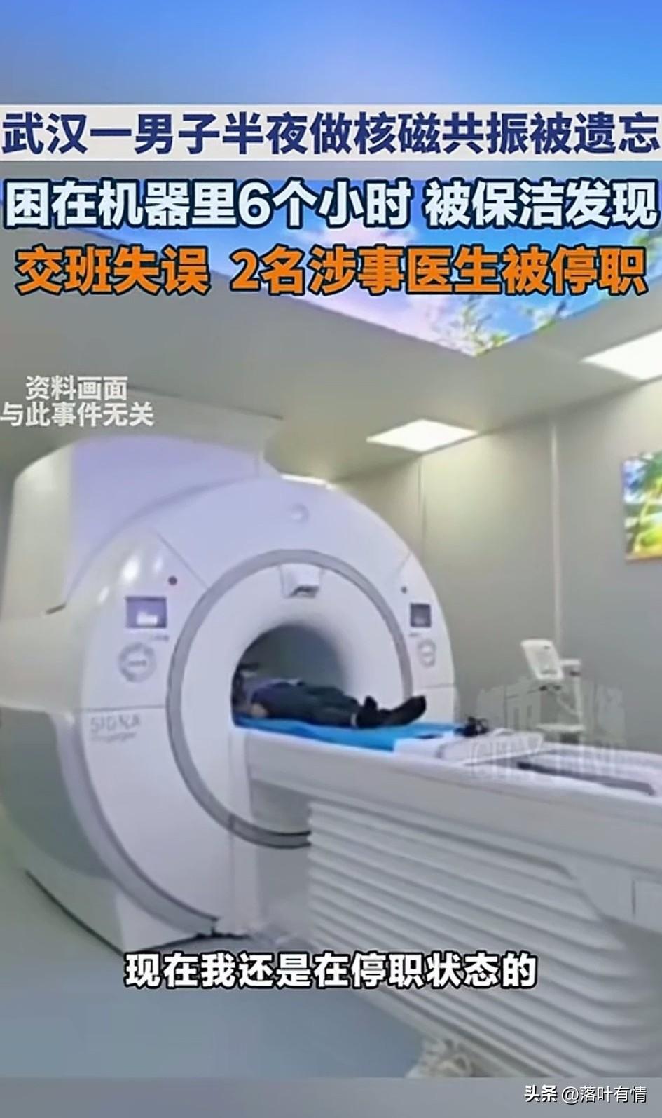 男子做核磁共振被遗忘一夜后续来了, 涉事医生被停职, 表示是因为交接失误导致, 这下同济医院彻底火了, 受害者唐先生半夜去做的核磁共振, 被医生绑上了机器, 核磁共振做了一半,医生不见了, 他呼救也没有人管, 就这样被人绑了一夜, 等到第二天喊救命, 还是保洁阿姨发现了他, 这才把它放了下来, 2月26号发生的事, 现在才发酵, 同济医院的嘴是真的严, 后来涉事医生被停职, 记者采访的时候医生表示, 自己当时被叫到了另一部门, 走之前特意做了交接, 没有想到后来的医生半夜可能忘了, 就这样把唐先生绑在了机器上6个小时, 这事听起来像笑话, 但却是实实在在发生的, 医院本来是救死扶伤的, 现在倒好成了笑话集中地, 这医生更是不负责任, 幸亏没出事儿, 要是出事儿了那怎么办? 大家对于同济医院这是怎么看?