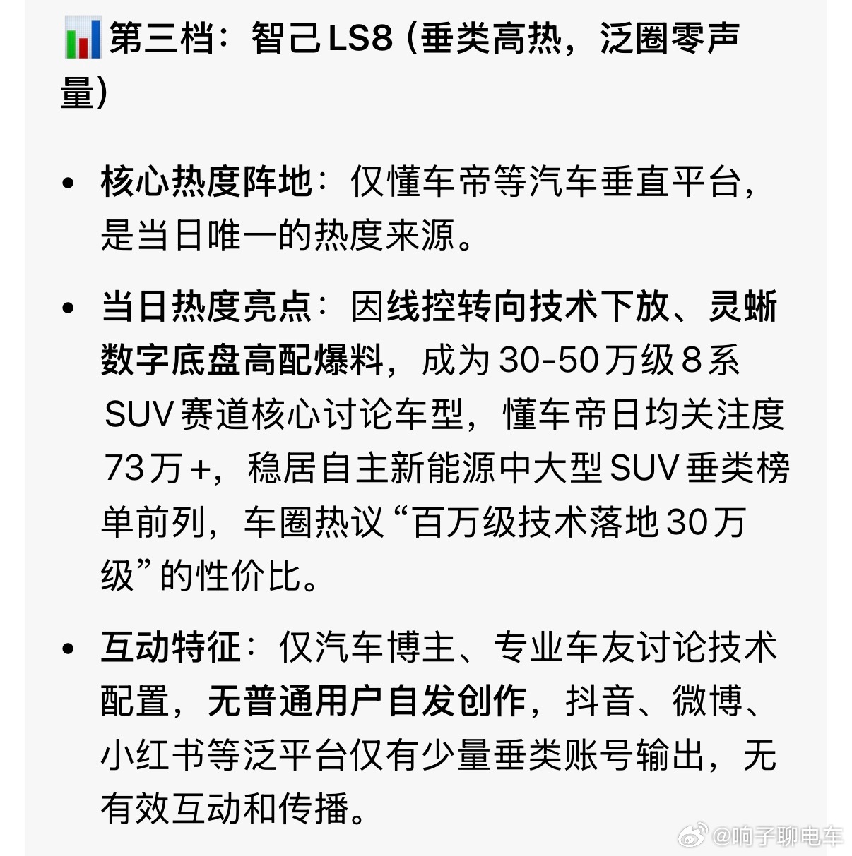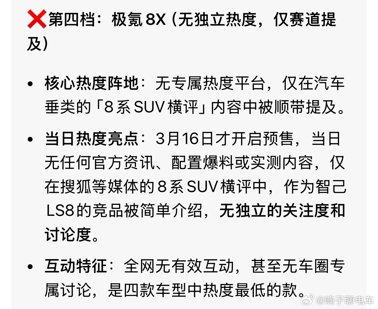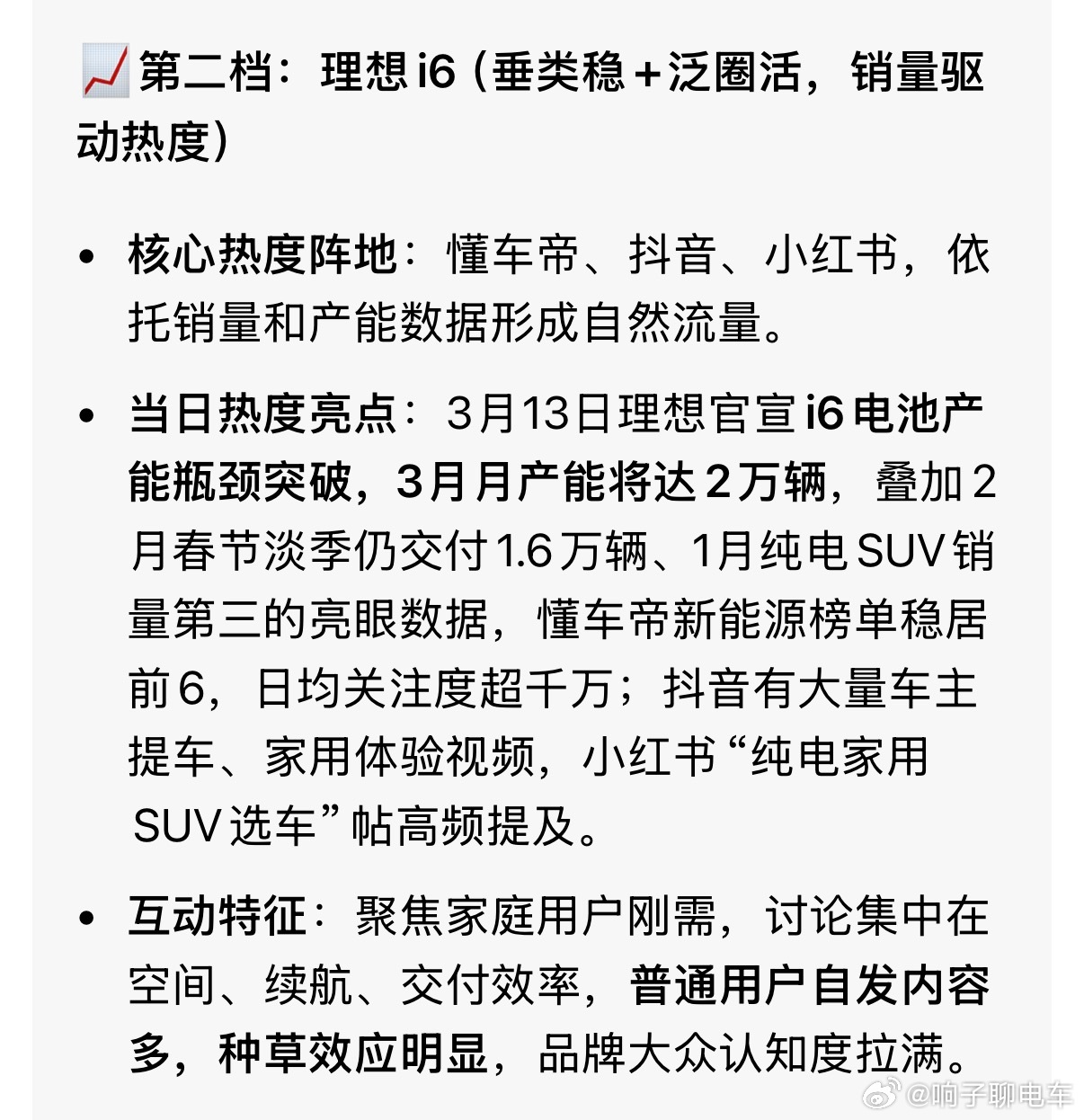 热度第一:问界M6天生流量明星热度第二:理想i6泛化能力强热度第三:智己LS8,线控破圈,垂内关注度高热度第四:极氪8X,无热度平台,无独立关注度你们认为豆包给出的答案怎么样 有没有代表性?