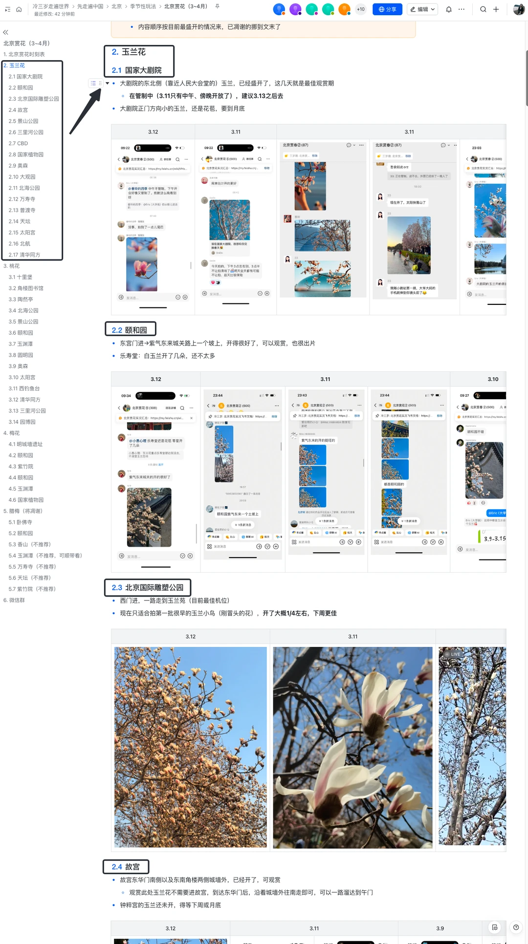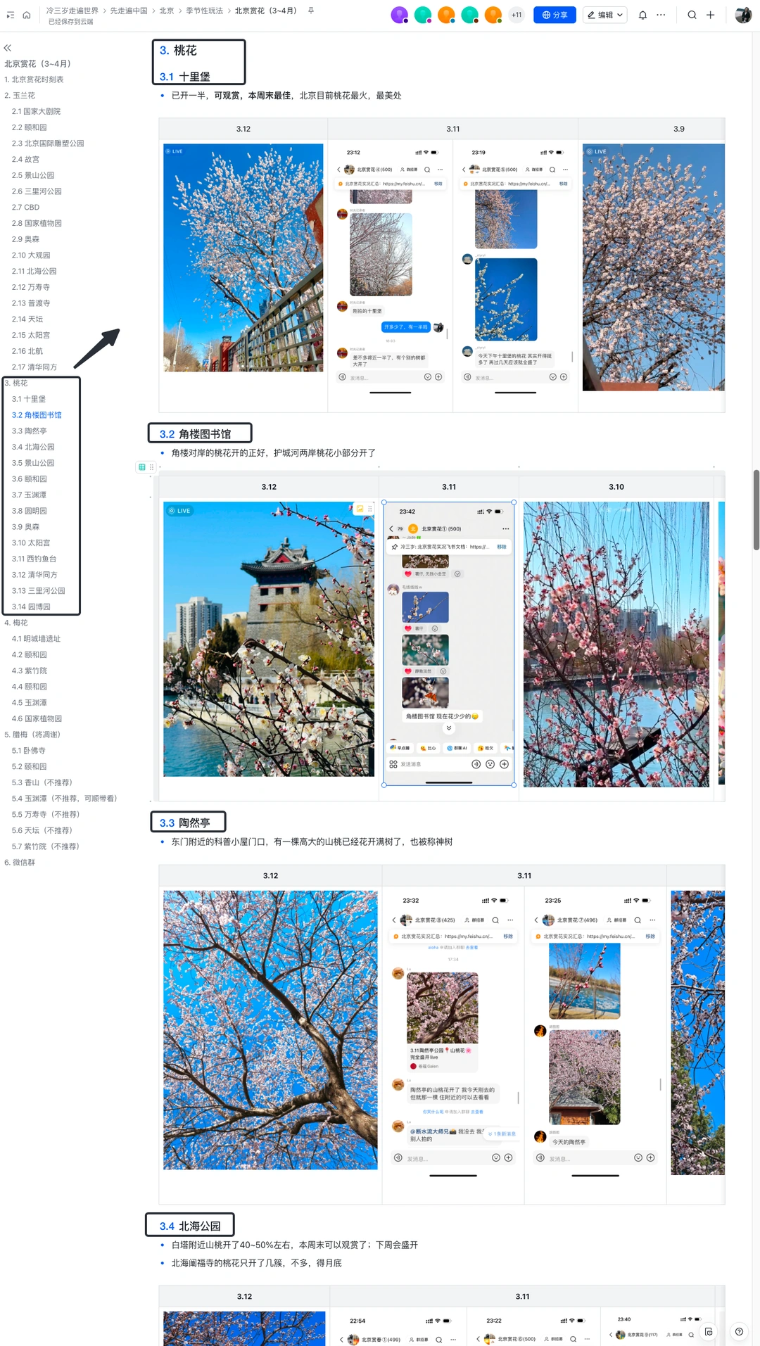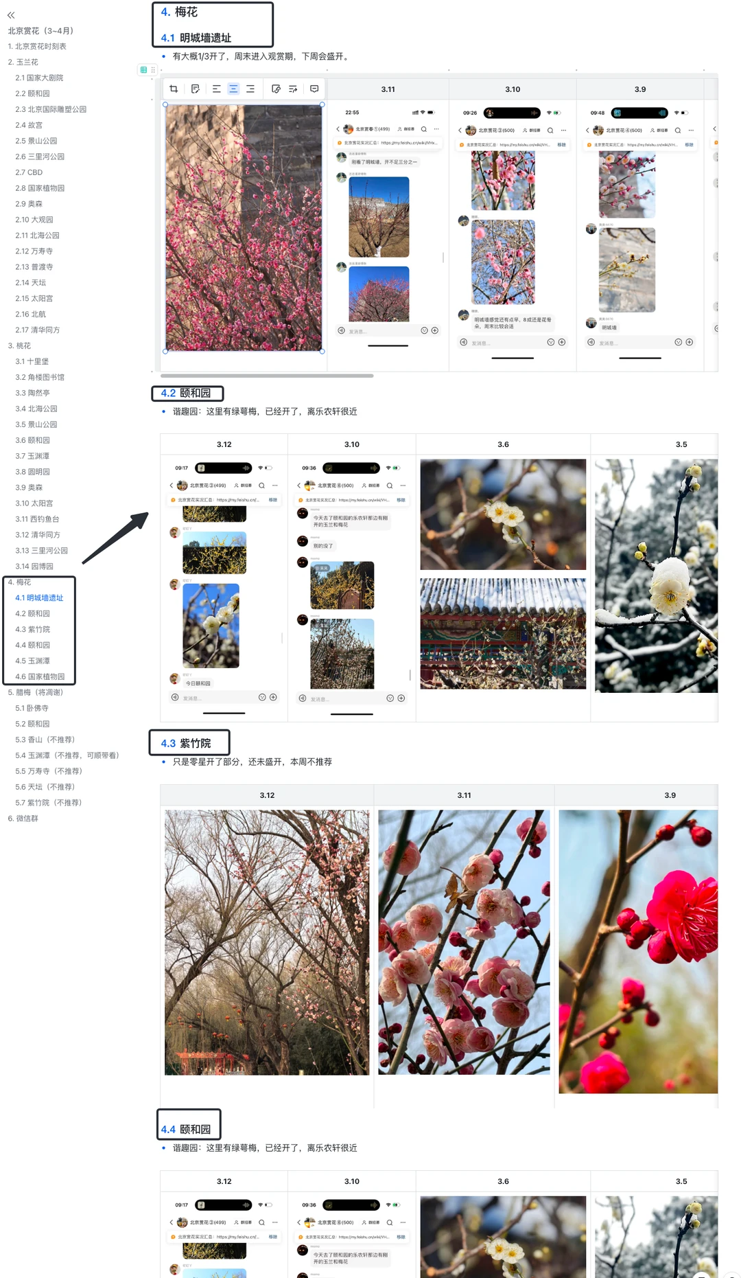 我赶紧把赏花群里大家反馈的照片、信息(图2~4),整理成了详细的文档(图5~7,涵盖了30多个地方吧)