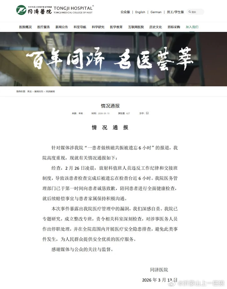 3月13日,华中科技大学同济医学院附属同济医院发布通报: