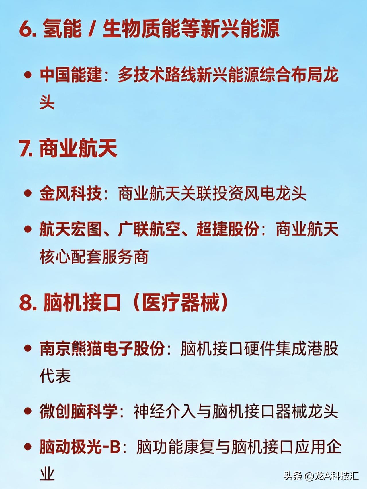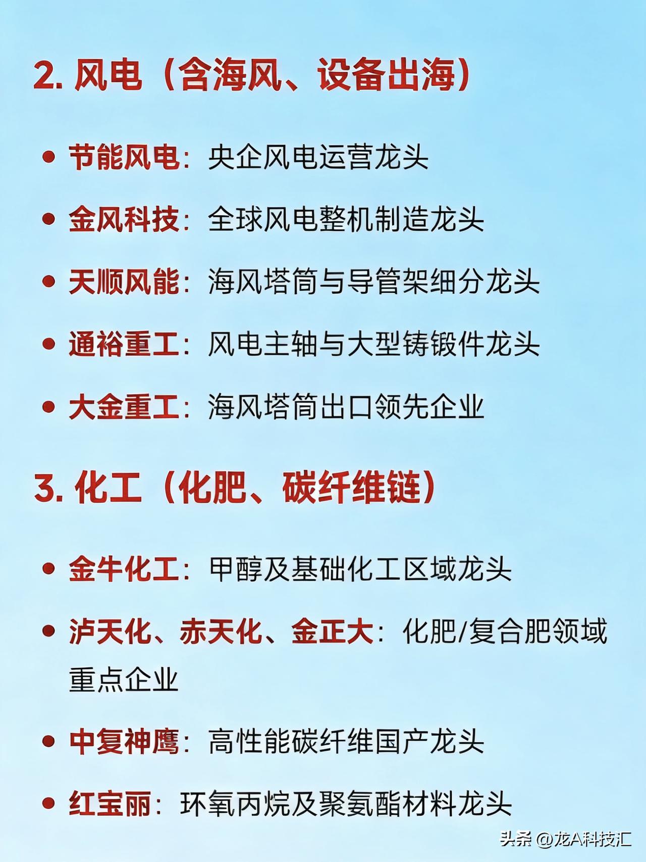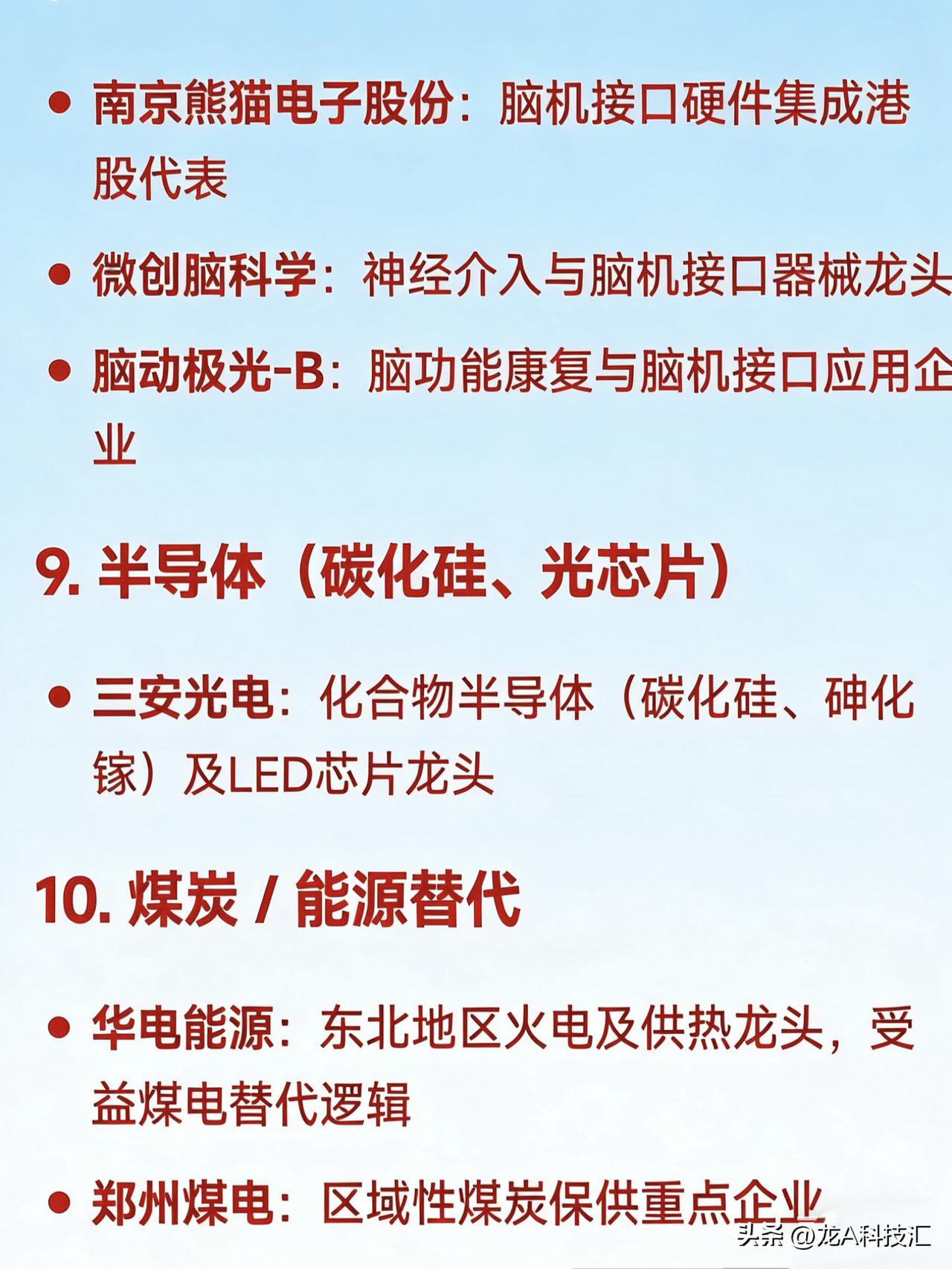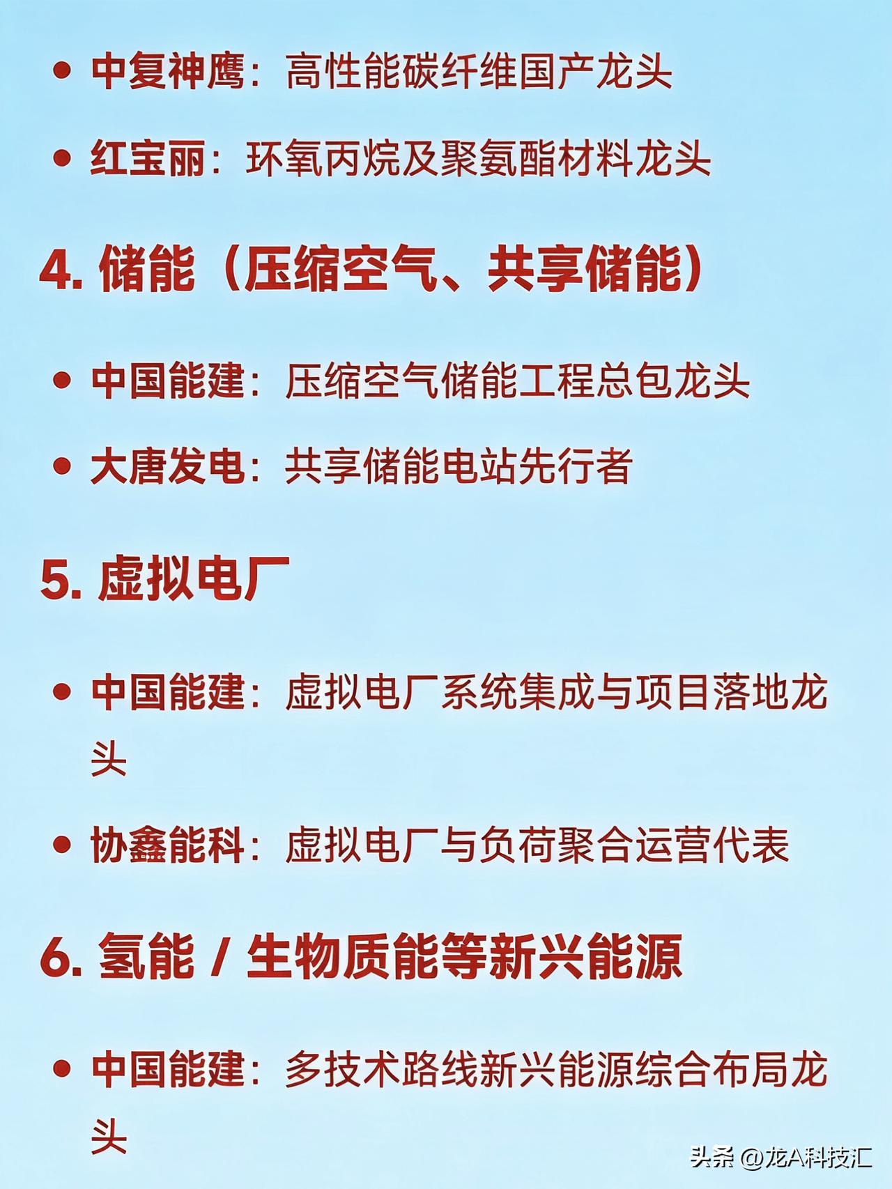 2026年3月13日十大热点概念及对应的核心热点企业 1. 算电协同 / 绿电+算力 中国能建:算电协同与新型电力系统基建龙头 金开新能:“绿电+算力”融合模式代表企业 协鑫能科:算电协同与智算中心运营龙头 绿发电力:中国绿发旗下唯一绿电上市平台 大唐发电:火电转型绿电并布局算电协同的能源央企 2. 风电(含海风、设备出海) 节能风电:央企风电运营龙头 金风科技:全球风电整机制造龙头 天顺风能:海风塔筒与导管架细分龙头 通裕重工:风电主轴与大型铸锻件龙头 大金重工:海风塔筒出口领先企业 3. 化工(化肥、碳纤维) 金牛化工:甲醇及基础化工区域龙头 泸天化、赤天化、金正大:化肥/复合肥领域重点企业 中复神鹰:高性能碳纤维国产龙头 红宝丽:环氧丙烷及聚氨酯材料龙头 4. 储能(压缩空气、共享储能) 中国能建:压缩空气储能工程总包龙头 大唐发电:共享储能电站先行者 5. 虚拟电厂 中国能建:虚拟电厂系统集成与项目落地龙头 协鑫能科:虚拟电厂与负荷聚合运营代表 6. 氢能 / 生物质能等新兴能源 中国能建:多技术路线新兴能源综合布局龙头 7. 商业航天 金风科技:商业航天关联投资风电龙头 航天宏图、广联航空、超捷股份:商业航天核心配套服务商 8. 脑机接口(医疗器械) 南京熊猫电子股份:脑机接口硬件集成港股代表 微创脑科学:神经介入与脑机接口器械龙头 脑动极光-B:脑功能康复与脑机接口应用企业 9. 半导体(碳化硅、光芯片) 三安光电:化合物半导体(碳化硅、砷化镓)及LED芯片龙头 10. 煤炭 / 能源替代 华电能源:东北地区火电及供热龙头,受益煤电替代逻辑 郑州煤电:区域性煤炭保供重点企业 免责声明:发文涉及资讯图等内容来自网络公共信息。仅供参考,不构成投资建议。