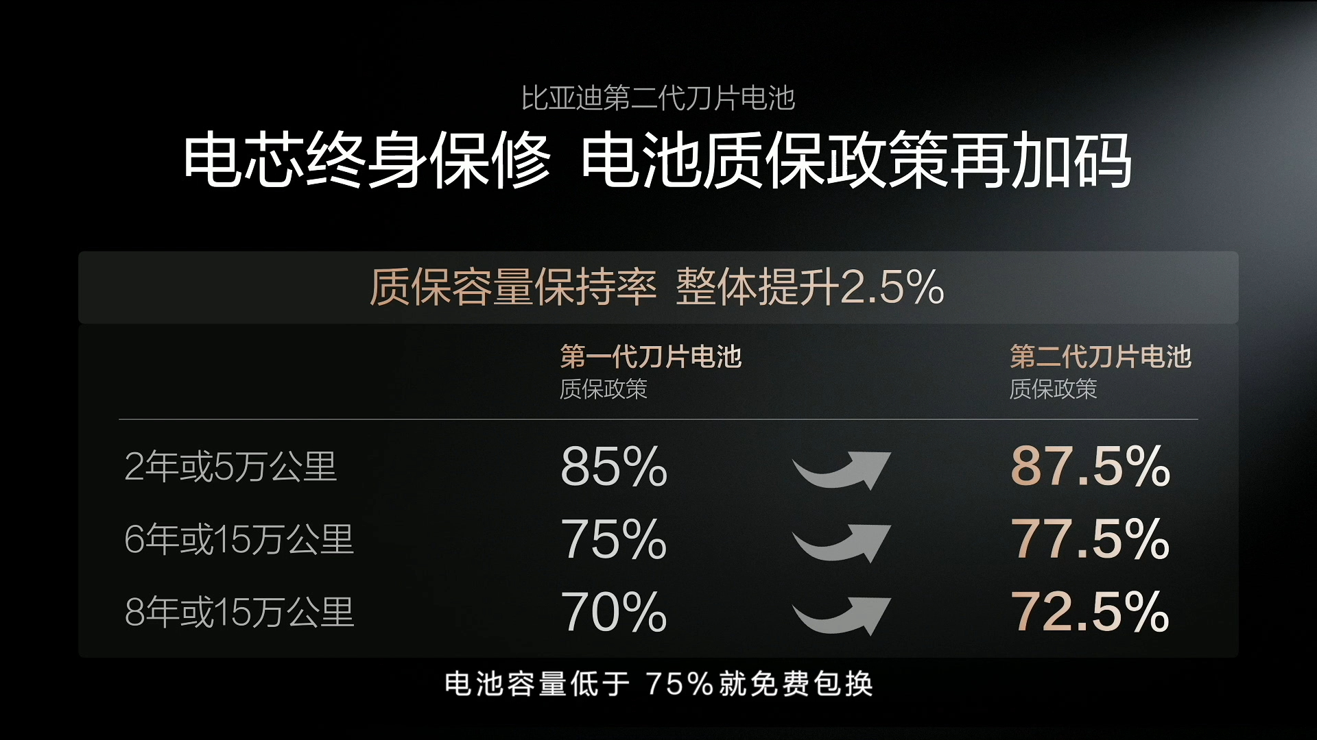 在技术层面,比亚迪通过打造“锂离子高速通道”和全温域智能热管理系统,让闪充过程中产生的热量更低、散得更快,从而实现“闪充与长寿命兼得”。不仅充得快,还更耐用。与此同时,第二代刀片电池质保政策也进一步升级,电池容量保持率门槛提升至77.5%,电芯依然提供终身保修,用实际承诺为用户兜底。