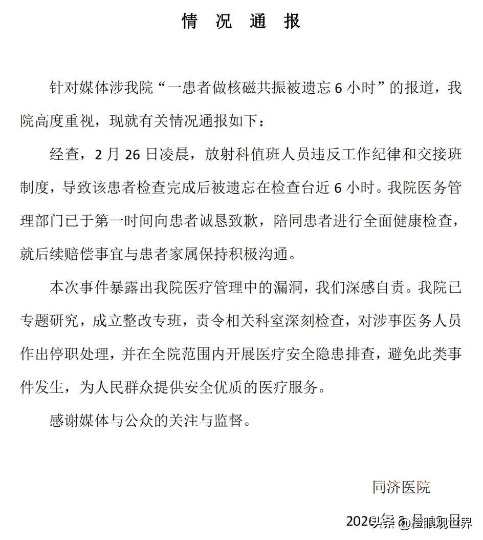 武汉三甲医院惊魂6小时:医生把人忘在核磁舱,保洁救命,一句“没辐射”寒透人心 武汉同济医院这事儿,看完头皮发麻。 一个本该15-20分钟的颈部核磁,唐先生被固定在黑暗狭小的机器里,整整6小时动弹不得,喊到嗓子哑没人应,最后是清晨打扫的保洁阿姨,把他从绝望里拉了回来。 这不是意外,是一连串低级到离谱的失职,击穿了我们对医院最基本的信任。 一、凌晨密室惊魂:被全世界遗忘的6小时 2月26日凌晨,唐先生因颈痛做核磁。 医生固定他的头、罩上面罩,启动机器后,直接走了。 - 0:10 检查就已结束 - 系统被提前标记“已完成” - 医生口头交代同事,转头没人核对 - 整层医护陆续下班,锁门走人 唐先生躺在漆黑圆筒里,不能动、看不见、喊不应。 机器整夜轰鸣,他不敢擅自挣脱,只能一遍遍呼救,从期待到绝望,这是精神凌迟。 更讽刺的是: 家属凌晨报警,医院查系统说“检查完了,人不见了”,没人去机器里看一眼。 直到清晨6点,保洁开门,才发现这个被“活埋”一夜的病人。 二、最扎心的对比:救命的忘了,扫地的救了 三甲医院,医生、护士、保安、值班人员一整班。 最后救人的,是保洁阿姨。 本该守好生命防线的人,把流程当儿戏: - 不现场确认 - 不复核交接 - 不巡查机房 - 系统点完就走人 两个医生,一个急着走,一个忘了查。 一句疏忽,就是一夜炼狱。 三、“没辐射=没伤害”?技术正确,人性缺德 院方和涉事医生反复强调: 核磁无电离辐射,对身体没影响。 这话技术上没毛病,但人性上缺德。 - 密闭空间6小时,极度恐惧、无助 - 肌肉僵硬、血液循环不畅 - 整夜精神崩溃,留下严重心理创伤 - 家属彻夜恐慌,差点以为人没了 把人关小黑屋6小时,然后说“没噪音就没伤害”? 避重就轻,淡化创伤,最让人寒心。 四、处理来了:2人停职,赔偿谈不拢 目前官方通报: - 两名涉事医生停职 - 科室整改、全院排查 - 院方道歉,承诺沟通赔偿 - 双方未谈拢,院方建议起诉 但很多人觉得: 不够。 - 这不是个人疏忽,是管理漏洞 - 无复核、无确认、无巡查、无兜底 - 夜班形同虚设,流程全线失守 道歉、停职、整改都该有,但精神损害必须赔。 患者受的罪,不是一句“工作忙、太累”就能抹平的 。 五、这件事,给所有人敲碎警钟 1. 医院再大、牌子再响,责任心掉地上,就是人命关天 2. 医疗无小事,再小的流程,也不能省 3. 比失误更可怕的,是麻木;比冷漠更伤人的,是习以为常 4. 我们去医院,是把命交出去,不是让你随手一放、转头就忘 希望唐先生能得到合理赔偿与心理治疗。 也希望所有医院记住: 机器没辐射,人心不能冷; 技术可正确,人性不能缺。 💬 评论区聊两句 1. 如果你被困6小时,会是什么感受? 2. 你觉得只停职、不重赔,能杜绝下次吗? 3. 去医院做检查,你有过被忽视、不放心的经历吗? 点赞+转发,让更多人看到,守住就医安全底线! 武汉同济医院 核磁被困6小时 医疗安全