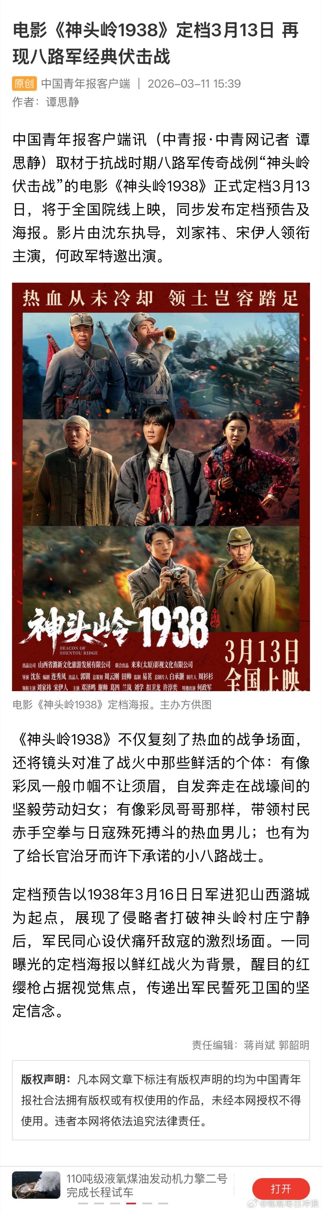 电影神头岭1938今日上映 宋伊人领衔主演的电影抗日电影《神头岭1938》今日上映,中国青年报也报道了